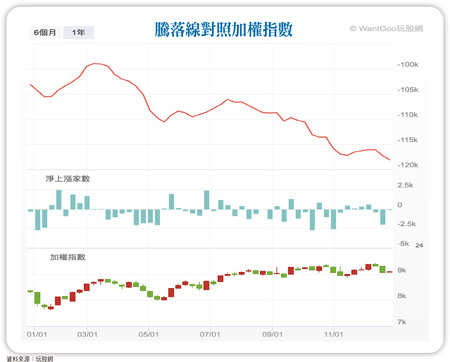 又到了年底,每年年底都會習慣做一下年度檢討,檢討一下今年做得好跟不好的操作,以及之後要怎麼維持好的,調整不好的。這個習慣還滿重要的,像我自己今年的檢討是沒有花足夠時間在投資做功課上,績效雖然是正的,但是不太滿意。完全沒想到要買台積電!台股從年初的八三○○點漲到十二月中的九四○○點,漲了一一○○點(一三%),但是我並沒有一直看多,也沒有一直偏多操作,所以錯過一大段。中間有一段時間因為看到騰落線一直跌(見附圖),上市股票只有台積電獨強,要買到除了台積電以外的強勢股其實很難,大多數股票是跌多漲少的,大盤大漲,大多數股票小漲,大盤小漲,大多數股票小跌,大盤平盤或小跌,很多股票就大跌了,所以我持股不多。那時候我只一心想著哪天台積電也撐不住的時候會大跌,沒料到台積電會一路漲上去。而且神奇的是不知道為什麼,當時我完全沒想到要買台積電,而是滿腦子只想著說台積電應該撐不久,總有一天等到你,到時候台積電掛掉,指數一起跌,其他中小型股也會被拖累,我就等著撿便宜(得意笑),結果台積電今年持續大漲小回漲了三五%。若真買台積電 初學者也賺得到錢這很有意思,因為我雖然買中型股居多,但其實我並不排斥大型股,我之前也買過鴻海、中華電信、國泰金控這種大型股,不知道為啥當時腦子會陷入死胡同一直繞不出來,後來回頭檢討才突然醒悟,既然當時只有台積電漲,那是不是應該買台積電?而不是一直覺得量價背離,上漲只是假象而已。再仔細觀察台積電,除了跌破季線那兩段修正,大多數時間都是沿著季線上漲,沿著季線操作就好,初學者也賺得到錢。很有意思,因為之前雖然也有發生錯過飆股的經驗,但是沒有像這次一樣幾乎每天都觀察一路看著台積電漲,然後每天都唱衰它,但是它就一路漲給我看的情況,而且台積跟大盤連動太深,所以我戴著有色眼鏡看台積電的時候,也會用不客觀的角度去看大盤,其實很明顯就是偏多,我卻時常會想著說等台積電崩掉,大盤也會被拖累。今年很明顯就是被心魔KO掉,即使是我這種操作近二十年的老屁股也會不注意就被心魔入侵,初學者更是要小心。