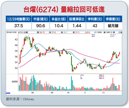 台燿(6274)為PCB上游銅箔基板(CCL)廠,產品包括CCL及壓合代工業務,其中CCL佔比約八○%,壓合代工約二○%,近幾年則專注於耐高溫、高速傳輸銅箔基板,目前高頻High tg產品技術領先國內同業,隨著物聯網、4G基地台大量建置,以及巨量儲存需求高速成長,台燿High tg的出貨量逐年攀高,目前佔CCL產品比重,已經由二○一五年的五○~五五%提升至六○%以上。台燿為國內首家量產應用於100G交換器的銅箔基板廠,近期接獲網通大廠長單,加上銅箔價格調漲,預估二○一六年第四季業績有機會超越第三季,呈現淡季不淡,從十一月營收創下歷史新高可知,台燿營運動能已在轉強。銅箔產業近幾年一直處於供過於求,迫使部分銅箔廠減產關廠,然而大陸為解決嚴重霧霾問題,自二○一五年起大力推動發展新能源車,過去銅箔產業只能應用在PCB,現在新增電動車鋰電池應用,而銅箔擴產又是重資本,就算設備不缺,擴產完成也要一年半到兩年,在需求強勁、擴產緩慢下,銅箔產業供不應求的情況可望延續到二○一七年。隨著物聯網時代來臨,雲端科技、資料中心等高速交換器需求起飛,雲端資料中心100Gb高速交換機也將放量出貨,而台燿為第一家量產應用於100G白牌交換器業者,預期將是資料中心高速交換器需求升溫的主要受惠者。