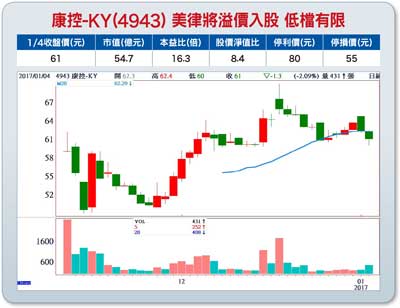 回顧二○一六年,年初在七八○○點上下時,我們就領先市場告訴大家去年年線將收紅,空頭已結束,開始準備展開大多頭行情,最後以九二五三點封關,總共上漲了一四五○點。二○一六年精準命中總複習甚至過去一整年的幾次關鍵轉折,如三月下旬八八○○點放空、五月中八千點補空翻多,然後一路作多到十月下旬九三七八點再翻空,避開九三九九點急殺至八八七九點五百多點拉回,十二月中旬九四○○點Fed升息前再提醒短線利多出盡要拉回,聖誕節前夕跌到半年線九一○○點上下又建議補空翻多,都在我們事先掌握規劃當中。預告台股今年兩波高點展望二○一七年對台股看法仍不變,最重要的大前提是不論美國和台灣景氣都比去年還要好,所以今年台股高點一定比去年九四三○點高。今年初至第二季中前,先往上反映第四季財報因新台幣貶值的匯兌收益,而使去年第四季季財報將優於市場預期,之後的融券軋空強迫回補,以及高股息殖利率公佈,指數應至少可看到九五○○到九六○○。之後反映第一季財報利空稍作回檔整理,然後年中在iPhone 8拉貨行情帶動下,台股準備上萬點。康控-KY(4943)主要從事模具及聲音元件四六%,其次為TFT-LCD及SET TOP BOX系列等連接器。董事長呂朝勝表示,公司堅持不停的開發技術,並持續擴充微型電聲、車用零件及醫療產能,今年精密模機具產能擴充將是去年的二倍,公司主力產品除了微型電聲之外,相關防水防塵的Insert-Molding製程也切入車用sensor的塑膠零件中,今年起車用產品將開始交貨。由於車用的相關零組件,包括車用的光學、聲波及相關偵測器的塑膠零件等產品,一台車子內的塑膠元件運用量多則百顆,少則五十顆,未來商機很大,相關產品今年起逐步出貨,將逐步開花結果。