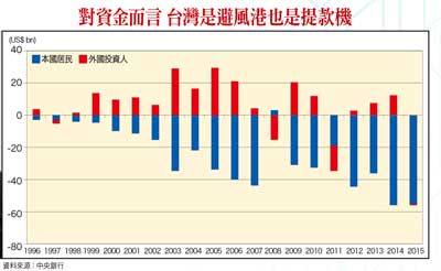 如何健全台灣資本市場?吸引資金回流才是正辦。據程淑芬說明,國人長期進行海外證券投資(上圖),而在金融市場動盪時,初期,台灣角色是避風港,後期,則成了提款機;看來,這是問題所在。就國內基金市場而言,境外基金的市佔規模超過百分之六十(左表);但程淑芬強調,本國基金在大中華區投資績效不比境外基金差,她也建議,本國基金業者應持續深耕大中華市場。程淑芬另指出,提高金融服務需求,必須轉化產業的發展瓶頸為機會,包括轉型、二代接班等。程淑芬描述金融服務與產業發展運作不協調的現況,目前,產業劇烈轉型,但對於創新創業的企業而言,因結構風險高,借貸不易;反之,台灣除金融業外的公開發行公司,整體淨負債淨值比亞洲最低,即:大企業不缺錢,卻是金融機構最樂於借貸的對象,結果,使得放款年增率呈現下滑走勢。錢有四隻腳 怎麼綁?捉住四隻腳的錢,政府也準備下重手。最近,金管會正研擬修正保險業海外投資管理辦法,重點包括限縮保險業投資中國大陸的額度等,投資中國由原不得超過海外投資額度的百分之五,縮小為百分之二.五,另投資中國大陸有價證券,由之前不可超過海外投資額度的百分之十,縮減為百分之五等。目的正是要引導資金回流台灣。政策奇招 另類黑天鵝?政府的新政,也引來房產業者罵聲不斷。其中,在市場上向來有房市多頭總司令的戴德梁行董事總經理顏炳立,更猛批二○一六年房市政策,對二○一七年的房市前景,大奏悲歌。顏炳立認為,政府房市相關稅負,是將房市交易推進冷凍櫃的「黑天鵝」。目前,市場上,買賣雙方的價差為百分之二十至百分之三十,沒有交集;業界更出現完工不請照,買地不推案的情況。對於二○一七年,政策發酵,顏炳立斷言,將使得房市再降溫。房子是用來住的 不是用來炒的面對交易市場冷清,蔡英文總統曾強調,房地產不應該是投資和炒作的商品,所以,顏炳立期待的房市交易熱絡,可以由需求端思索對策嗎?台灣進入言論多元的時代,話語權背後連結特定的商業模式;只是,政策一旦涉及分配,拉扯似乎已成必然的結果。針對房地產稅制,學界也發出不同聲音。財團法人禧年經濟倫理文教基金會執行董事胡業民指出,稅制在居住正義上扮演重要角色。我國的現行稅率有土地稅和房屋稅,土地稅主要根據公告現值課徵,房屋稅則依據房屋坪定現值課徵,併稱房地產稅;在台灣,以一棟一千五百萬的房子而言,一年約需繳納稅金一萬元,在國外,稅率則約是房價的百分之二,即:一棟五十萬美元的房子,需繳稅約一萬美元,易言之,台灣繳稅一萬新台幣,而美國繳交一萬美元。對此,胡業民反問:台灣的房地產稅貴嗎?事實上,相較於美國,台灣的房地稅很低,所以,台灣很容易成為房地產炒作的天堂。最近,房地產持有稅吵得沸沸揚揚,但究其實,這個稅率也很低,以自住而言,是百分之一.二,公告坪定現值逐年下跌,土地的公告現值也是多年未調,兩者加總起來,大約是市價的三分之一或四分之一。
