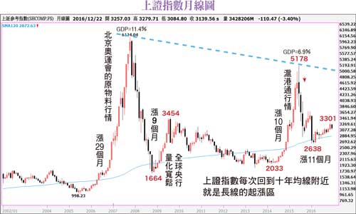 上證指數從一九九○年開市以來,在這二十六年的歷史中,發現長線大波段的起漲點,大多落在十年均線附近,例如二○○三年十一月底的一三○七低點,漲到二○○四年三月的一七六○高點,累積漲幅達三四.六五%,歷時四個月。二○○五年六月的九九八低點漲到二○○七年十月的六一二四歷史高點,累積漲幅達五一三.六二%,歷時二十九個月。二○○八年十月的一六六四低點漲到二○○九年七月的三四五四高點,累積漲幅達一○七.五七%,歷時九個月。二○一四年七月的二○三三低點漲到二○一五年六月的五一七八高點,累積漲幅達一五四.六九%,歷時十一個月。二○一六年一月的二六三八低點漲到同年十一月的三三○一高點,累積漲幅達二五.一三%,歷時十個月。剔除二○○五~二○○七年因北京奧運會的基礎建設原物料大爆發的五倍漲幅行情之外,其餘四次行情漲幅大致介於二五~一五○%,多頭的時間四~十一個月,因此站在長線的角度,二○一六年已經漲了一整年的多頭,在十二月收黑K休息反而是件好事(如附圖)。漲多拉回修正 持續到二月十二月的K線構成當沖五絕的「紅黑並列,翻空買跌」的轉折偏空訊號,恰好就在深港通正式上路的消息面公布,情況極度類似二○一五年滬港通在一月正式上路後,也同樣出現一波利多出盡的拉回修正,兩次都是在農曆春節前出現漲多拉回,換言之,有可能這波修正的時間要持續到二○一七年二月,等待三月的人大政協兩會定調施政政策後,多頭的買氣才會積極的進場,展開一波預期A股入摩(MSCI)的上漲行情。因此就波浪的角度,當下有可能處在長線第四波複雜波的C波拉回位階,詳細定位是4-C-5波,以十年均線為下方支撐參考的話,估計大約有二三八~四七○點的下跌風險。為什麼行情要等到過完農曆春節之後呢?因為下彎的年線。根據葛蘭碧均線八大法則─突破下彎的均線,是賣出訊號,而上證指數在二○一六年十月二十四日突破下彎的年線之後,雖然經過二度回測,但是截至聖誕節前,年線仍然是下彎的,大約還需要二十八個交易日才有機會由下彎扭轉為上揚,所以就算再次回踩年線三○二七點支撐,也還在合理的拉回修正預估範圍內。