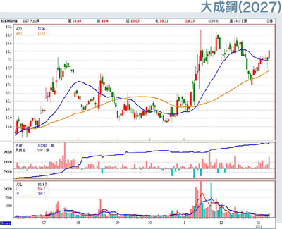 中國政府二○一七年延續「供給側改革」基調,國家發改委表示將以更高要求施行去產能,預計春節前完成公布今年鋼鐵煤炭去產能方案,有助進一步改善產業供需情況。另因中國武鋼最新開出二月份內銷盤價,除熱軋、線材、中厚板等產品價格維持平盤外,其它冷軋、熱鍍鋅、電鍍鋅及非方向性電磁鋼片等多項產品價格都上調,每公噸漲一百~五百元人民幣,顯示中國鋼品市場需求不弱,可望帶動亞洲鋼價持續向上推升。受兩大利多激勵,鋼鐵族群重回台股盤面強勢焦點,類股指數也跟著站回月線之上,有望搭上本波資金追逐「漲價題材」的熱潮。美國最大不銹鋼板通路商大成鋼(2027),美國營收占比高達九成,將是川普擴大基礎建設政策下的主要受惠者,吸引外資在川普當選後積極加碼買進,推升股價邁向多頭循環。由於鎳價占不銹鋼板原料成本達五成,大成鋼的不鏽鋼捲板產品報價主要參考前兩個月的鎳價變化,LME鎳價自第二季底的每噸九四二○美元,上漲至近期的一○五八○美元,公司因擁有低價鎳庫存,預期第四季毛利率有望增加,二○一六年EPS將由負轉正。持股達四十五%的子公司大國鋼(8415),為美國最大碳鋼、合金鋼扣件都通路商,同樣是川普擴大基礎建設的受惠者。隨著機械設備需求可望回溫,有助帶動工業扣件銷量,市場預期在低價庫存利益挹注下,大國鋼今年上半年毛利率仍可望維持高檔。