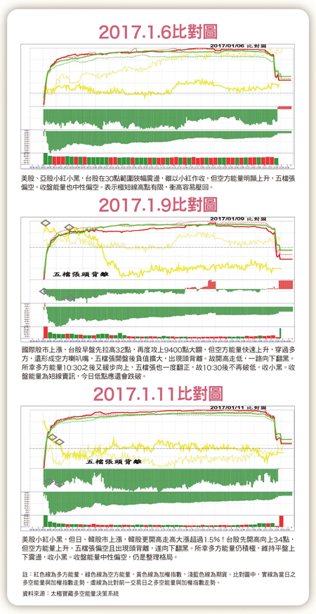 本波台股從十二月二十三日見到九○七八低點之後,震盪向上八天,上周四(一月五日)更以帶量中紅棒站上九三○○~九三一七點的壓力區,當天我在盤中媒體連線時,即說明台股站上九三一七點就會挑戰九四○○~九四三○點的壓力區,但以能量及成交量狀態,不可能一次越過,就算能攻到壓力區,也還是要來回測九三○○~九三一七點的支撐區(原本的壓力突破後變支撐)。本周一(一月九日)加權指數來到九四○四點,進入壓力區,但空方能量快速上升,穿過多方,還形成空方喇叭嘴,五檔張開盤後負值擴大,出現頭背離,故開高走低,一路向下翻黑。收盤能量為短線賣訊,表示應如預測要回測九三○○~九三一七點。周二(一月十日)國際股市小紅小黑,台股果然向下來到九三一九點,十分接近九三一七點的支撐。空方能量較周一大幅下降,多方能量上升,故力守支撐,緩步向上收小紅。收盤能量中性,表示短線支撐有效,將會在九三○○~九四○○點之間區間震盪一段時間。周三(一月十一日)美股小紅小黑,但日、韓、港股市上漲,韓股更開高走高大漲超過一.五%!台股先開高向上三十四點,但空方能量上升,五檔張偏空且出現頭背離,遂向下翻黑。所幸多方能量仍積極,維持平盤上下震盪,收小黑,果然仍是整理格局。