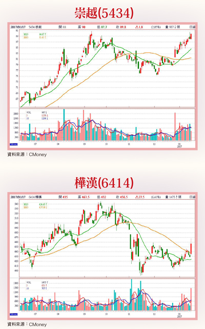 由於歐美股市主要指數,目前依舊維持多頭、高檔盤堅型態未變,絲毫不畏懼英國「硬脫歐」決定系統性利空衝擊;同時,也可明顯看得出來,金融市場仍然對美國新總統川普上任後,即將開始施行的各項「強國新政」有所期待,最明顯的例子,即為那斯達克指數目前仍一度創下歷史新高。因此對台股而言,短線仍舊有如獲得一定支撐力道般,大盤指數於短期間內出現突發性轉折、大幅回檔修正跌勢,機會應不大。另一方面,市場主力依舊持續在台股場上「上下其手」、「呼風喚雨」,盤面上仍然可以見到多檔挾著籌碼面穩定度高、基本面特定利多題材,市場預期後市股價漲升空間大等優勢個股,相繼強彈走揚、大漲續強,短線盤面市場氣氛仍明顯持續偏多格局。本週理周投研部精選財報營收實績表現亮眼、成長力道強,產業基本面前景展望佳、營收成長動能轉強機率高,外資、投信搶先上車,拉高市場籌碼穩定度,後市有機會見到股價走出波段漲勢鏢股者:祥碩(5269)、崇越(5434)、樺漢(6414)等個股。祥碩合理投資價浮現祥碩(5269):台灣高速介面控制晶片&裝置端高速控制晶片專業廠。由於國際半導體與核心處理器大廠-英特爾(Intel)、超微(AMD)將於今年第一季同時推出下一世代新款核心處理器規格平台,相繼配置「獨立USB 3.1」及「Type-C控制IC」晶片出貨,因而帶動台灣「USB控制晶片廠」祥碩,上半年營收業績出貨量明顯擴增,市場法人預估其全年營收實績,可望成功挑戰倍數成長高門檻。由於英特爾「Kaby Lake」處理器平台、超微「Ryzen」處理器平台兩大對立陣營,同時採用獨立USB 3.1、Type-C控制IC晶片搭配出貨,因此有利於台灣控制IC大廠-祥碩優先受惠轉佳市況。中游及終端應用市場上,自處理器大廠至PC/NB組裝廠,同時見到雙雙力挺Type-C應用風潮熱烈市況,預料今年全球Type-C應用市場滲透率,將快速、大幅衝高達五○%以上。祥碩除了繼續維持與英特爾既有合作關係外,與超微亦具策略性長期合作默契,於「SATA 3.0、PCI-E、USB 3.1」等相關應用領域,持續為超微供貨「I/O hub控制IC」。法人指出,Kaby Lake、Ryzen處理器相繼於首季推出問世,預料將可有效帶動祥碩「USB 3.1控制IC」後續出貨量明顯增加,有助其上半年營收優於預期,全年出貨量亦有望見到倍數成長。法人預估祥碩今年全年營收約三五.三二億元,率三一.四○%左右,全年EPS約可進一步成長達一五.六三元。