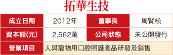 拓華生技成立於二○一二年,致力於人與寵物口腔照護產品的研發,人用產品以T-SPRAY為系列,根據市場需求性細分為三個系列,有主打女性使用的Premium及Light、兒童的Kids系列等;目前產品上市一年,在台灣已有兩千五百個實體的銷售據點,並有二十個網路通路在進行販售,除導入康是美、屈臣氏等實體通路外,也在虛擬通路PChome、OB嚴選及自有官網上販售。推出寵物專用牙膏 減少口腔問題 延長狗狗壽命寵物方面以狗為主,推出狗狗專用牙膏,拓華生技董事長周賢松表示,根據調查,五位飼主當中就有一位不替狗狗刷牙,這也是為什麼有八○%的狗狗都有口腔疾病的問題。這些口腔疾病衍生出牙周病的問題,嚴重將導致牙周病的細菌藉由血液擴散到身體其他部位,進而感染到心臟、肝臟或腎臟,也因此若能做好口腔保健,狗狗的平均壽命也會比較長。拓華因創新研發技術與產品取得國發會天使創投三百萬元投資,以及經濟部新創事業獎金質獎,除獲經濟部中小企業處報導為潛力優質廠商,更被亞洲期刊Asian Scientist報導為二○一五年十大生技創新產品。研發全球第一片牙齒專用的面膜該公司自行研發的醫療級3D齒模貼片品牌TOOTHFILM(齒舒芬),號稱為全球第一片「牙齒用的面膜」,目前獲得台灣及美國專利,也通過生物相容性及動物的臨床實驗,證實使用上的安全性與有效性。該產品針對有術後照顧需求市場做設計,其優勢是能夠長期阻絕唾液的影響,利用該貼片作為一個載體,根據不同用藥配方進行簡易的居家治療,但由於單價較高,目前還沒導入量產,尚在尋求最適合的商業模式。周賢松指出,台灣口腔噴劑、照護用產品在市場占比不高,而是以牙膏及漱口水為主流商品,但他也觀察到,在拓華導入產品通路後,提高同類商品市場能見度,可有效帶動整體市場活絡,由於主打日本上班族女性最愛的淨白美齒品牌Ora2市場銷售量提升一倍,連帶拓華自有品牌銷量也提升一.五倍,數據明顯呈現成長態勢。