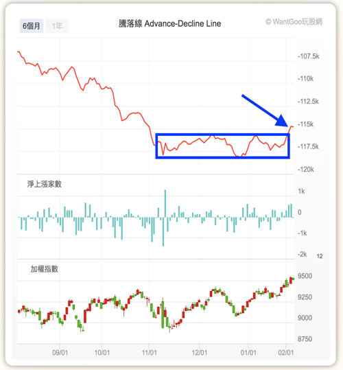 我在過年前一月中旬有寫過一篇文章講之後台股的行情規劃,我當時說:「美股持續走強,這對台股一定是正面的,加上台股已經整理半年之久,不過整理半年也差不多了,我判斷不會太久就會出方向,方向會往哪兒走呢?以我自己的操作經驗來看是要觀察盤整區間透露的訊號,當整理時是高過前高,低不破前低,這種整理就是多頭佔優勢,整理結束後往上走的機率比較高,這半年來的走法暗示的方向也是這樣。」當時文中的圖是低點在八九○○點,高點在九四○○點,從去年七月中到現在已經整理了半年之久,衝了三次都被打下來,中間遇到一些國際利空也沒有被打破低點,盤整區間上下緣的支撐壓力都很堅固。權值股跟中小型股同步走強 賺指數賺價差現在呢?今天已經九五○○多了,順利突破盤整半年的區間上緣,所以之前判斷正確,當盤整是走向上整理的盤,代表說趨勢是向上的,有人硬壓著不給漲,等到鍋蓋掀開,自然就會往上衝。多方還有一個優勢,騰落線持續上揚(見附圖)。如果你這兩年有持續在看盤,你應該會跟我一樣感覺很開心,因為這陣子的騰落線竟然跟大盤一起同步過高。這種現象真的很難得,好久沒看到了,過去這兩年因為台積電跟大立光獨強,所以大盤往上走,騰落線(大多數股票)卻跌多漲少,現在終於能權值股跟一般中小型股同步走強,這才是健康的多頭走勢,之後才有機會走得遠,而且不會發生明明看著指數在漲,我手中股票卻跌多漲少的悲劇。最近有個比較特殊的多轉空型態,二月二日台指期出現空頭吞噬,加權指數出現大量+烏雲罩頂,這兩點都是技術分析裡面多轉空的轉折訊號,以技術分析的角度來看,出現空頭吞噬後很可能會大跌,所以在突破二月二日高點以前,就算看好之後行情也不適合大幅加碼,不過在二月六日大盤跟台指期都已經突破二月二日高點,所以空頭吞噬的威脅已經解除掉。
