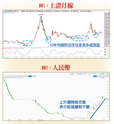 據歷史經驗,上證指數的十年均線往往是長多起點,從圖一可以驗證,不過跟前三次長多起漲模式不同的是,這次從二○一六年一月二六三八低點起漲是緩漲且幅度不大,而前三次都是高角度的急漲且幅度大。要解釋這個轉變,最明顯的證據就是二○一四~二○一五年的滬港通行情,吸引了大量境外資金參與,以至於在二○一五年上半年所創造的歷史大量曾一度超越全球最大股市(道瓊指數),可以說泡沫程度過大,以至於套牢割肉的投資人至今仍驚魂未定,面對行情的上漲保持冷感的態度,致使單日量始終不足三千億,僅達二○一四~二○一五年的一五~二○%,如此低迷的單日量,多頭只好採用板塊輪動的方式來博弈。儘管上證指數的月KD支持新一輪的長多啟動,但為了更長遠的目標─金融改革,諸多來自政策的監管措施(例如查險資舉牌)陸續出台,抵銷了政策利多,如國企改革、供給側改革、PPP等,自然也是造成本波多頭緩漲的因素之一。此外,向來以出口為主的經濟體,儘管近年都在進行調結構的慢慢轉向內需為主,但畢竟出口仍是目前經濟推升的主力,而二○一六年PMI製造業指數從年初的低於五十,到年末連續四個月站穩五十一,雖有成長,但僅算回溫,並不支持股市有大漲特漲的條件,這是不利多頭大漲特漲的負面因素之二。同時貨幣戰爭的煙硝悄悄升溫,美聯儲啟動升息循環,新任美國總統川普以美國優先口號當政策,四處點火貿易戰爭,中國當然也在其名單之中,以至於人民幣從去年下半年起就步入貶值循環,直逼一美元兌七元人民幣的八年新低(圖二),人民幣貶自然不利上證指數的資金行情,這是不利多頭大漲特漲的負面因素之三。因此二○一七年的上證指數雖有政策支持國企改革的利多,但另一方面金融改革的監管動作限制了股市投機式的大漲,反映在技術面上,就變成了十年均線有撐、二年均線有壓的緩漲格局(圖三),因此今年上證指數空間預期在二八○○~三六○○點之間做箱型震盪。川普就任之後,簽署多項行政命令,落實選前支票,嚇得市場開始警覺,川普不是選前講一套,選後做一套,造成VIX恐慌指數上揚,道瓊指數一度突破二萬點整數關卡,卻又跌回十二月中到一月中區間盤整的一九八二○點上下震盪。因為川普近期曾評論美元指數太貴了,一點也不符合美國優先的利益,市場解讀為兩百年來首位就任總統直接批評強勢美元的政策不利美國,美元恐將走弱,造成美元失守百點整數關卡,拖累道瓊指數下跌。