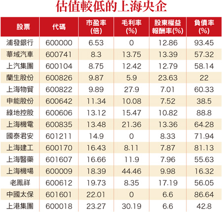 上證指數有回升跡象。在二月九日量增實體陽線且突破季線反壓,屬於突破底部型態頸線的技術面買點,然後順利拉出連續增量的三連陽,顯示農曆春節之後游資回流股市,讓0000三一五○點以下成為兩個月的底部區,多頭準備挑戰前波三三○一高點反壓。保守的情況下,從一月十六日的三○四四低點進入到大B波的反彈,一樣有機會接近或假突破三三○一前高;在樂觀的情況下,從去年十一月二十九日的三三○一高點拉回修正到今年一月十六日的三○四四低點是一波到底的五波結構,如果走這個模式,則二月九日的攻擊陽線暗示多頭有機會重返回升走勢,因此不僅需要偏多操作,而且投入資金可依個人風險承受程度,適當地放大,但因屬於慢牛的緩漲,所以拉回買進比追漲來得好。加速推進競爭類企業混改二○一六年十二月三十日召開的中央深改組第三十一次會議指出,要加強對國企、財稅、金融、土地、城鎮化、社會保障、生態文明、對外開放等基礎性重大改革的推進,在十九大召開的二○一七年有些改革要真正落地,例如供給側結構性改革。今年一月底,北京、重慶、江西、山西等地二○一七年國資國企工作會議陸續召開,上海近期將召開一年一度的國資國企改革大會,改革主線包括加速推進競爭類企業混改,借力國資流動平台調整國資佈局等。此外,原本基本面較好的企業,會進一步做大做強,還有混改中的員工持股也將是未來的重點之一,將遴選五至十戶企業展開首批試點,較有機會成為試點主力的企業有:上港集團、上汽集團、上海建工等企業。估值較低的上海央企如附表所示。此外,地方國企混改細則密集出台,多地進入試點企業遴選期。天津今年計畫安排三○%左右混改,二○一八年重點推進,二○一九年收尾。廣東省國資委一月提出首批試點企業五至十戶。