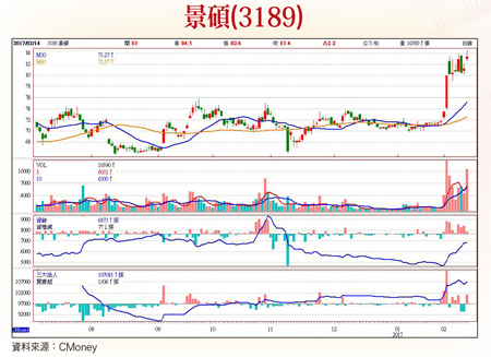 景碩是新規格受惠者 蘋果供應鏈今年熱鬧可期。其中,股價處於長線底部區的景碩(3189)值得關注,由於二○一七年三款新iPhone主板均採SLP設計,但僅OLED iPhone採用堆疊SLP。OLED iPhone受惠於採用成本較高的堆疊SLP,故能維持單手操作之大小,且同時擁有更長電池使用時間。由於SLP線寬線距為30μm,顯著小於目前iPhone採用的Any-layer HDI的50/40μm,所以可縮小主板面積且較省電。在載板生產過程中最小線距可以達到15μm/15μm,意味載板製造商生產SLP的競爭力會高於HDI製造商。目前類載板所使用的材料為FR4或FR5而非BT,層數為八~十層。法人預估OLED iPhone的堆疊SLP成本約六~八美元,因尺寸較小,技術要求較高故單價高出新款TFT-LCD iPhone非堆疊SLP約六十~八十%,相較於目前iPhone採用的Any-layer HDI僅約三美元,毛利率更高。目前的消費性電子產品持續朝輕薄短小與低功耗發展,而堆疊SLP設計,能減少主板面積,並增加電池配置空間與提升電池容量。受惠於堆疊SLP設計,預期OLED iPhone與4.7" TFT-LCD iPhone差不多大,而電池容量(配備約2,700mAh的L型2-cell電池)與5.5" TFT-LCD iPhone相當。因OLED面版較TFT-LCD省電,故OLED iPhone續航力將優於5.5" TFT-LCD iPhone。目前堆疊SLP主要供應商為景碩(3189),景碩具有使用MSAP生產載板的經驗,因此景碩良率高於台灣的其他同業,將成為新規格的最大受惠者,法人預估今年EPS在七元以上,本益比不高又具成長性。中小型股仍受市場青睞台股今年與去年最大的不同就是漲升結構,去年是外資主導的行情,指標集中在台灣五十成份股。今年至截稿前,則是中小型股活蹦亂跳、此起彼落,有資產題材、轉機題材、產品漲價題材、價值低估題材等等。當然,冷灶一旦燒熱,交易慣性通常會持續一段時間,小型股的市場尋寶活動仍將持續。例如泰碩(3338),產品區分為散熱模組、散熱管、連接器、讀卡器,營收佔比分別為一○%、六四%、二○%及六%,主要客戶為品牌廠,包含聯想、HP、Dell 等,散熱管客戶除PC品牌廠外,也包含美日遊戲機廠商。雖然第一季為傳統淡季,但新產品效應仍具加分效果。由於大陸中興基地台供應比重最高的供應商,去年第四季供貨不順,促使今年中興基台散熱的供應比重重新洗牌,泰碩可望因此受惠,公司預估通訊產品今年營收年增率將達五成。雲端部分,泰碩為聯想及中興伺服器的散熱模組供應商之一,下半年藉由Intel Purley平台推出,將切入白牌伺服器供應鏈,並擴大聯想及中興供應比重。行動裝置方面,手機Type C連接器,為今年開發的新產品,預期第二季開始出貨中國品牌客戶。行動通訊產品成長主要將落在下半年。今年整體毛利率將因產品組合優化而提升,法人預估EPS將挑戰三元,本益比不高,進可攻退可守。