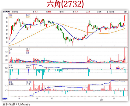 美食是台灣強項 未來具成長空間台灣美食聞名全球,但過去投資人難免擔憂國內市場太小,成長空間不大。但換個角度想,如果在極度競爭的環境下能脫穎而出,並跨足其他國家的市場,就不可小覷了。例如六角(2732),旗下共有六個品牌,其中包括四個自創品牌,「Chatime」日出茶太、「ZenQ」仙Q甜品、「La Kaffa」六角咖啡及「Bake Code」烘培密碼,以及兩代理餐飲品牌,銀座杏子日式豬排與段純真牛肉麵,營運據點分布全球四大洲,二○一六上半年營收以區域來看:台灣、東協、歐美澳及其他占比分別為三五%、二九%、三三%及四%,國際管理經驗相當豐富。六角最成功的品牌日出茶太目前已在馬來西亞、印尼、緬甸成為手搖杯龍頭,預估二○一七年韓國與印尼將各展店五十家以上,日出茶太總店數將淨增加約一○○個至七八○家;牛肉麵品牌「段純貞」將加速展店六家,總數達十二家,預估年營收貢獻倍增至二.五億元,營收占比約可達一一%,營業淨利增至一○%以上,並可望取得清真寺認證,技轉至東南亞市場。杏子豬排全年再展店兩家,總店數二十家,年營收貢獻將年增一六%至五.八億元,營收占比約二五%;代理新品牌的大陸探魚將於四月在台中展店(全年目標兩家),大阪王將餃子將於三月開始展店(全年目標五家),預估餐飲營收比重將逾五○%(二○一六年約三成)。六角 今年每股要賺六.八八元公司策略將加強歐美市場,例如於美國紐約開設直營店,建立北美經營團隊,希望能深耕美東及美西華人市場,並開拓中南美洲市場。觀察去年第三季的營益率,已由第二季的五.八六%拉升至一四.二三%,市場評價有提升空間(給予較高本益比)。受惠段純貞、杏子豬排等餐飲次品牌高成長,法人預估二○一七年六角營收年增約一二.九%,增至二三.七億元,營業利益率將較去年整年度增加一.五%,稅後淨利將年增三一.七%至二.一億元,估EPS六.八八元,創歷史新高,值得追蹤。
