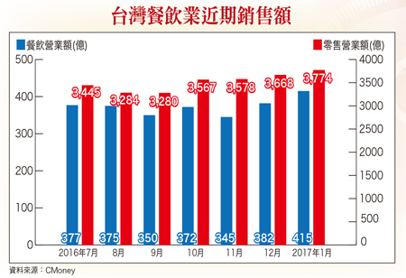 外資動向看美元匯率 升息與否看美國公債雖然FED三月升息機率小,但市場數據顯示五月升息機率超過五成,六月升息的機率達七成。主因在於日前公布的貨幣政策會議記錄表示,在美國經濟穩定改善,川普政府計畫減稅、增加公共支出與鬆綁金融法規管制,已形成市場對美國經濟成長加速與企業獲利增加的樂觀預期,若因此導致通膨快速攀升,FED可能被迫加快升息腳步來抑制經濟過熱。不過,投資人也不必杞人憂天,FED會議中也強調這些計畫細節與潛在政策改變,也可能讓美國經濟蒙上不確定陰影,尤其是升息過快不符合美國利益。目前美國三十年期固定房貸利率已升破四%,超過不及三%的薪資成長率,升息過快恐打擊內需經濟。投資人欲掌握市場利率動態也不難,只要追蹤美國十年期國庫券(十年期公債)期貨走勢即可,任何市場預期都將快速反應在期貨價格上。只要十年期國庫券價格未重挫,對升息就不必有過度疑慮。而對於台股指數的研判,要先觀察外資的態度,外資的態度又取決於美元的強弱。美元未明顯轉強,外資撤出機率小,台股可維持高檔整理,伺機挑戰萬點;反之,則資金可能暫時撤出亞洲,不利台股加權指數攻堅。零售及餐飲營業額創新高 尋找台灣軟實力商機台經院日前公布廠商景氣動向調查,業者對景氣看法進一步樂觀,製造業景氣在過去幾個月已領先回溫,一月製造業營業氣候測驗點為一○○.○四點,較上月減少一.三九點,因元月工作天數少,而服務業營業氣候測驗點,連續第二個月走升,營業氣候測驗點為九一.四四點,創下二十個月以來的新高,其中景氣看好比例較高者為餐飲業。觀察經濟部公布之數據,一月零售業及餐飲業營業額雙創歷史新高,分別達三七七四億元(年增三.九%)與四一五億元(年增一○.五%)。台灣美食聞名全球,如果在極度競爭的環境下能脫穎而出,並跨足其他國家的市場,就不可小覷了。台灣的珍珠奶茶名聞天下,台灣人這幾年賣珍珠奶茶,勢力範圍不只賣遍了亞洲,如今美國、歐洲、紐澳甚至中東國家,都能品嚐得到,連遠在歐洲波羅的海邊的小國立陶宛都喝得到。雖然口感未必跟得上台灣,但在立陶宛這樣低物價國家,每杯還可賣到二.五~二.九歐元不等(美國芝加哥約五美元)。台灣國民美食遠渡重洋,幾乎任何異鄉都能賣個好價錢,這就是軟實力,上周介紹的六角(2732)就是其中的代表之一。本周再舉一例。