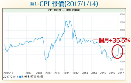 一月中的時候談到油價補漲股中石化(1314)跟集盛(1455),之前在我帶學員第一次操作這個產業的股票中,集盛從九.二元漲到十二元,漲了三○%,中石化也從十.一元漲到十三元以上,同樣是漲三○%,近期兩檔股價皆因漲多而整理,而當時構成這兩檔個股能夠大漲三○%的背後關鍵因素,正是己內醯胺(CPL)的大漲。現在CPL還是繼續大漲,為什麼?當時中石化、集盛股價分別為十元、九.二元,現在三月初,股價分別為十二.七元、十一.八五元,這次為何又再一次的分析?因為油價這一個多月以來,呈現出來的是高檔震盪,在五十一~五十四美元間震盪不跌,這樣的背景構成中石化相關的產品如CPL的基本有效支撐。歲修減產帶動 CPL報價上漲再看圖三CPL,相信長期看我分析的朋友都很清楚,CPL就是紡織的上游原料,CPL漲愈多,對中石化或是集盛的獲利愈有幫助,可以看到報價不僅沒有漲多回檔,反而是一直繼續上漲。在兩張CPL報價走勢圖中,可以很明顯看出,CPL的趨勢仍持續上漲中。再比照油價走勢圖,可以發現最近兩個月的油價,呈現出來的是高檔震盪,並沒有像之前一樣繼續大漲。可能有投資朋友會覺得奇怪,最近一個月油價在五十一~五十四美元之間震盪,也沒有漲,為什麼CPL的報價還是繼續上漲?到底為何CPL報價卻能夠一直持續上漲?