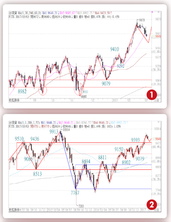 首先我們來看台現貨的日線圖,這次來到月線圖的箱頂九八二○之後,出現五日止漲缺口的回檔修正波動,我們可以看到圖中其ma1的上漲次箱頂底在九五五五到九五四三,次級的上漲次箱頂底在九四一○到九二九二,若能在九五五五到九五四三止跌算正常的回檔,若來到九四一○到九二九二則多頭有比較弱勢一些,日後就要注意往上出現二十日的止漲缺口或末段行情了。紅色的向上波動幾乎都要出現止漲缺口或末段才會結束此波行情,如之前所說從九○七九往上八百點也要到九八七九與實際高點很接近,若從八八八○計算那就已經漲一千點了,因此往下修正休息一下是很正常的。我們再從周線的角度來看台現貨線圖,目前要注意的是過了九三九三到九四三六到九五一○之後,需要出現一個不破的訊號,後面還有一次往上攻堅的機會,因此目前回測九五一○到九四三六到九三九三這三個強中弱的支撐帶也屬正常的走勢。若回測不破之後,再往上過不了九八二○到九九一三則要提防三月份的一些顯著事件是否影響到資金的流向。從日周線圖知道現在是修正回檔行情之後,繼續來看台線貨的月線圖,我們可以發現過了九七一一到九八二○這個箱頂壓力帶之後,回測九四三六到九一四五這個支撐帶還有一次往上攻堅的機會,因此三月份先視為上下三百到五百點的區間震盪行情。