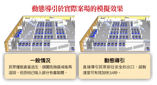 動態導引可以加快民眾疏散速度瑞德感知成立於二○一三年,主要研發動態導引系統,該系統會自動分析建築物內的危險情況,即時改變動態導引號誌的指示方向,引導群眾前往安全的出口,有效提升建物公共安全。智慧監控可隨時監控並掌控空間內情況,瑞德感知採用美國國家標準技術研究所(NIST)的標準技術來驗證動態導引功能,使用分析火場內之氣體與固體溫度、壓力、煙霧濃度隨時間變化之情形的軟體,以十立方公分為單位的高精度方式打造真實場域,再以3D方式呈現並進行「建築物防火避難安全性能驗證」模擬火災及避難疏散狀況。改變商業模式 貼牌搶市佔經科學驗證至今,已模擬眾多大型場所並分析其數據和結果,成功證明導入動態導引系統,可以給予民眾正確的逃生方向指示,有效提高人員反應能力、加快民眾疏散速度;此外,更使用高標準性能驗證(FDS+EVAC)取得數據以隨時改善產品性能,除升級消防安全外,未來更可能結合發展軟體成為打造智慧城市的一大利器。「作為先行者當然會有困難」,林筱玫指出,要改變台灣根深蒂固的產品模式,初期,就曾遇到與傳統廠商在同樣一個場域懸掛公司產品,卻被對方依照消防法規檢舉,產品馬上遭客戶退回,這也讓林筱玫更注重在產品認證的申請,並在取得台灣消防產品認證後,反而使得當初客戶轉向全面使用他們的產品,這也替林筱玫打了一劑強心針。目前旗下「出口標示燈」及「避難方向指示燈」產品已取得台灣「消防機具器材及設備型式認可書」,獲准取代傳統避難方向號誌及出口燈具。主力產品依照價位及客戶需求區分,現有三種產品類型及規格,林筱玫提到,對於產品,客戶較注重在產品價格,即便想再增加產品功能性,但在成本及客戶需求考量下,也只能作罷。各國發展趨勢 預案型vs.動態導引而產品當中最基本格式的商品,原本與傳統商品有高達十倍的價差,但在改良並降低成本後,成功將差距縮短為三倍的金額,林筱玫指出,以現今的台灣市場而言,仍舊是傳統廠商的天下,為搶下市場佔有率,拓展產品知名度,瑞德感知改變商業模式,與既有傳統廠商合作貼牌,減少自行行銷成本,合作廠商也能省下自行研發成本,達到雙贏。目前發展較為成熟的國家有英國、德國及中國等,目前除瑞德感知外,還是以預案型為主。英國透過產學合作,以多樣系統根據實際狀況進行分析,最後再由人員手動選擇最佳逃生路徑;德國INOTEC則是連接消防總機,危險時觸發預先設定好的逃生路線,連動逃生指示燈及地燈裝置。