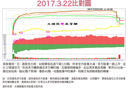 國Fed上週四(三月十六日)凌晨如預期升息一碼,且會後發言平穩,維持今年升息三次的基調。美股持平反應,亞股除日股外,幾乎全面上漲回應。台股也在台幣大幅升值帶動下,大漲九十七點,突破九八二○點壓力。上週五(三月十七日)更進一步突破九八六九高點,直接攻上九九○○點大關。本週一(三月二十日)美股、亞股小紅小黑,台股先拉回三十九點,九點二十分後多方能量開始向上,五檔張尾盤也一度翻正,帶動指數收小紅。但收盤能量為短線賣訊,表示短線雖仍有再向上的空間,但要留意隨時會見高回檔。三月二十一日美股小紅小黑,亞股漲跌互見,韓股大漲一.一%以上!台幣正式升破三十.五大關。台股開高震盪走高來到九九七六點,距萬點已不到三十點。但空方能量明顯上升,多方能量衰退,五檔張明確偏空,均張負值大增。故我在盤中連線三立財經台時,明確建議九九五○點之上應先站在賣方,以能量而言,大盤隨時會回測九八○○~九八五○點支撐區。三月二十二日受美股重挫影響(道瓊跌二三七點,Nasdaq跌一.八%,費半指數更重挫超過二.三%),日、港股也大跌,台股開低迅速下殺一二九點,低點九八四三點果如預期回測九八○○~九八五○點支撐區。所幸空方能量大減,多方能量一路上升,且九點十二分穿越空方,形成多方鱷魚嘴及多方喇叭嘴。五檔張明確偏多,且出現多重底背離。果然九點零六分後一路拉抬收高,僅跌四十九點,留八十點下影線。收盤能量中性偏多,短線又有挑戰高點的機會。