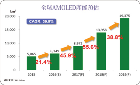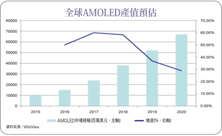 中國成中間體主要生產地在大陸方面,由於OLED發光材料技術門檻較高,市場化程度很低,主要由日、韓、歐、美廠商控制,中國尚沒有企業能掌握核心技術。上游OLED發光材料的國際廠商,一般將中間體和單體粗品等環節外包,中國是主要的中間體和單體粗品的生產地。目前全球整個產業鏈佈局,AMOLED中間體及昇華前材料主要集中在中國,相關企業主要有:西安瑞聯、西安彩晶、萬潤股份、吉林奧來德、北京阿格蕾、吉大瑞博、濮陽惠成、北京阿格蕾雅、萊特光電等。其中,萬潤股份、濮陽惠成、西安瑞聯、萊特光電等都已實現規模量產,並進入全球OLED材料供應鏈。中國為了彌補上游材料的技術缺口,近來積極與全球領導廠簽署合作供貨協議。中國天馬微電子與美國UDC簽署五年的專利授權及材料採購協議,UDC提供天馬專利授權,並向天馬販售UDC的磷光材料。廣東聚華印刷顯示技術與德國的熱活性型延遲螢光(TADF)材料開發公司CYNORA完成簽署合作備忘錄,雙方將針對OLED電視的開發進行合作。還有,強力新材與昱鐳光電、韻金投資、淇聞投資在常州共同簽署投資合作協議,共同出資設立常州強力昱鐳公司,主要從事OLED有機材料、聚?亞胺溶液及薄膜、OLED封裝材料、光刻膠等電子材料的研發、生產和銷售。全球材料市場規模百億美元上游材料在AMOLED產品總成本中的占比超過百分之三十,特別是與元器件發光有關的發光材料是整個AMOLED的產品核心。根據Display Research預估,二○二○年AMOLED材料市場規模將達到近百億美元。三星因先行預訂Canon Tokki的蒸鍍設備,造成後進者產能建置進度拖延,使得多數廠商的產能,可能延至二○一八年之後才能正式開出。二○二○年前,三星將持續獨霸AMOLED市場,市佔率達百分之六十以上。目前全球AMOLED量產能力最佳者為韓國,三星除了供應自家智慧型手機及平板電腦使用之外,也開始外賣給中國手機品牌,二○一七年則將獨家供應給蘋果iPhone 8。LG Display初期佈局以RGBW製程為主,並積極瞄準OLED TV市場,後來因應蘋果需求,為了有利未來切入iPhone面板供應鏈,也積極建置SBS製程。繼韓國量產AMOLED面板後,日本也積極投入研發與生產,夏普在鴻海入股後,也積極規劃投入AMOLED研發與生產。台灣部分,友達為業界最早量產AMOLED的廠商之一。中國官方除投入大量資源於既有LCD面板生產外,也不願缺席先進技術的AMOLED產業,目前已有多家廠商先後投入生產。其中,又以和輝光電領先同業,已經正式供貨小米旗下的紅米Pro手機使用;京東方也積極佈局,針對AMOLED投入大筆資本支出,規劃四條AMOLED產能,且產出面板也將供應紅米Pro手機。另外,和輝與信利也表示將投資可撓式AMOLED。
