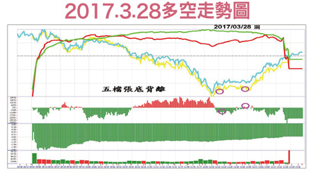 上週本欄已清楚說明,目前台股尚無波段反轉的危險,加權指數在九八○○至一萬點之間震盪,以個股表現為主。上週四(三月二十三日)美股小紅小黑,台股高點來到九九四五點,狹幅震盪收小紅。有外資將台股目標調高到一萬一五○○點,市場重燃攻萬點的期待。但收盤多方能量較前一天衰退,空方能量卻大幅上升,收盤能量為短線賣訊,表示大盤有短線回檔的危險。上週五(三月二十四日)美股小黑,亞股小漲小跌,台股空方能量上升,多方能量衰退,五檔張早盤出現頭背離,雖僅收小黑,但收盤能量賣訊增強,回檔趨勢不變。上週五美股小紅小黑,本週一(三月二十七日)台股繼續拉回二十六點,收盤能量賣訊不變,均張負值還擴大到○.七四張。果然三月二十八日在美股開低走高,亞股大多向上的有利環境中,台股開高先拉四十七點後,空方能量一路向上穿越多方,還形成空方喇叭嘴,大盤遂從高點一路下殺一二四點,最低跌七十七點,破九八○○點大關!尤其櫃買指數重挫超過二.二%,許多股票出現恐慌下殺!但能量賣訊反而減弱,故我在十二點多和三立財經台連線時(剛好破九八○○點),強烈建議投資人,不要追殺在此處,破九八○○點就是短線絕佳買點。果然十二點十分之後多方能量一路向上,五檔張出現底背離,尾盤遂拉出七十七點下影線。但因收盤能量仍為短線賣訊,只是賣訊減弱,表示還會回測,但九七九九點應是短線低點。