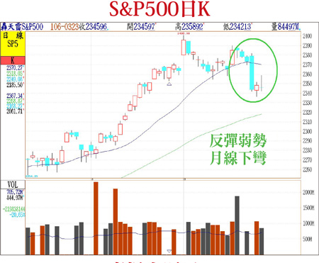 美股四大指數在三月二十一日一根長黑摜破月線之後,反彈走勢相當疲弱,若以S&P500指數來觀察,月線已經開始出現下彎的走勢,而未來近一個月的時間將會持續扣抵在二三六○點以上的位置,因此,如果指數無法再次快速站回二三六○點之上,則月線反壓將會越加沉重。其中以結構面來看,過去領漲的金融股,如:摩根大通、美國銀行等都早已摜破季線,只要未來站不回季線,美股就會走弱,甚至不排除會再次出現下跌,最糟的情況就是,金融市場並沒任何利空因素的時候,指數還重挫,這才是最壞的情形!美股無買盤 流動性風險大而這樣的現象對筆者來說並不意外,從籌碼的大換手就已經可以推知美股接下來肯定會有一波大震盪,現在對於美股來說最可怕的事不是會跌,而是跌了之後沒有買盤,美股現在出現了流動性風險,過去當大家都在等著大盤跌想要趁著回檔修正時再進場,但是因為一直苦等不到回檔,失去耐心的散戶一窩蜂地利用巴爺爺最愛的ETF進場,這種行為造成過去美股該跌不跌,同時也軋到空單。當上週五面臨到「四巫日」時,一口氣結算完的衍生性金融契約也讓空單全數陣亡,造成美股的軋空力道快速減弱,而當時空手的散戶也已經透過ETF進場,手上根本沒有子彈可以再趁回檔時進場,一時之間美股的買盤陷入真空狀態,這樣的真空狀態如果真的持續,美股未來若是再回檔,單日跌幅超過二%以上恐怕都是正常,向下沒有買盤,只好一直向下改價,直到有人願意接手為止。在這段期間,市場上將陷入恐慌拋售潮,只是現在金融市場看來並沒太重大的利空會引動這樣的跌勢,但能持續多久?美國的債務上限、FED利率政策等都可能觸發賣壓!