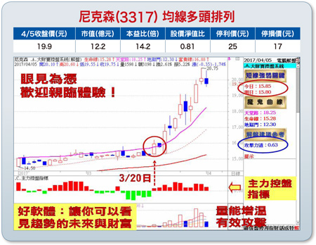個股推薦:尼克森(3317)為國內同時具備高效率電源轉換系統、類比控制IC、高電壓功率元件及特殊半導體製程設計能力之IC設計公司,截至目前,尼克森微電子榮獲全球計五十多項專利,審查中的專利尚有數十件之多。主要利基題材有:(1)營運表現搶眼,順利轉虧為盈:受惠訂單激增,營運從去年第二季開始明顯彈升,第四季更繳出超亮眼成績,單季合併營收達六.三七億元,創近十季新高,歸屬母公司稅後淨利○.二九億元,較去年第三季大增超過三倍,EPS達○.四七元,優於市場預期,累計去年合併營收二三.六四億元,年增一六.八%,歸屬母公司稅後淨利○.六八億元,EPS一.一元,創七年來新高。(2)MOSFET供不應求,第二季起營運喊衝:第一季雖因傳統淡季,工作天數減少,加上新台幣升值等不利衝擊,營運表現受影響,不過,受惠英特爾及AMD晶片架構改變電壓配置方式,需要搭配MOSFET增至三~四顆,需求大增,加上以物聯網為中心的節能聯網家電、智慧電表、穿戴裝置、遠端安控等嵌入式系統,汽車電子對MOSFET使用量也大增,MOSFET市場前景具爆發成長性。反觀供給面部分,自日系供應商陸續退出供應鏈,去年下半年轉單效應明顯發酵,加上國內包括漢磊(3707)與茂矽(2342)代工產能不多,MOSFET市場自去年下半年起成長快速,報價也從今年第一季起止跌,在供給端出現缺口情況下,第二季報價可望調漲,有助相關概念股營運再攀高峰。(3)隨著量能增溫,法人及公司派心態偏多,且技術面亦處於相對有利位置,後市行情仍值得留意(※基本面資料若有異動,依公開資訊觀測站最新訊息為主)。操作建議:低接不追高,下檔只要守穩十七元整數關卡不破,逢低於富貴線至天堂路間仍可留意,設好停損停利(詳見附圖說明)。
