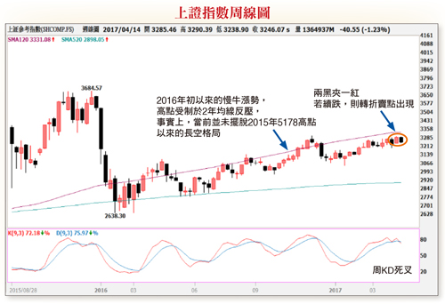 上證指數周K線圖最近三周共出現過兩次量增價跌陰線,顯示在三二五○~三二八○點之間有籌碼釋出的劣勢,換言之,對於近期曾經出現過爆大量而下跌的個股要有風險意識,需要設立止損。在缺乏題材亮點的當下,第一季度財報是可以關注的議題。截至四月十三日在發布一季度業績預告的一二五六家公司中,預增的公司有三九七家,預減的有七十六家,續盈的有六十三家,續虧的有一四五家,首虧的有七十九家,扭虧的有一一五家。軍工板塊注意有新型題材從行業別來看,業績提升的行業落在鋼鐵、煤炭、化工等,而目前這三個板塊的走勢明顯利多不漲,可見得農曆春節之後的一帶一路到最近的雄安概念股,把指數從三○四四低點拉到三二九五高點,應該已經反映第一季度的業績增長利多,所以短期不管是指數或是個股,都面臨風險大於獲利機會,操作上應該適當的降低股票部位,提高現金部位。根據二○一六年年報顯示,軍工板塊大部分目標業績持平,有新型型號的公司才有機會業績爆發,因此關注:(1)在武器裝備建設大框架下的有海空軍新產品定型預期的公司,如中直股份(600038)有新型十噸級通用直升機的定型列裝,中航黑豹(600760)有殲-16的列裝交付。(2)受益於軍工體制改革,如軍民融合、混改和資訊化改造的公司,如耐威科技(300456)慣導+MEMS絕對龍頭+航電的整體布局完整,航天晨光(600501)、神劍股份(002361)、國睿科技(600562)、四創電子(600990)、湘電股份(600416)等。