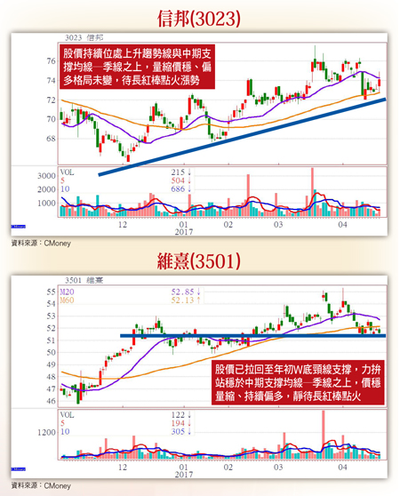 健和興計畫於中國公共、私人充電樁市場,發揮既有競爭實力、客戶關係經營優勢,可成功搶下五~一○%市占率(以一○%市占率估算,截至二○二○年底的五年內,相關充電槍訂單粗估約可達三千八百萬美元以上,約達十一.八六億元新台幣總額)。公司預估今年整體車用產品線營收比重,將可進一步上看達占比二○%。後續如果國際銅價未再出現大幅度波動態勢時,預估今年毛利率水準可望持續拉高,全年營收業績表現亦將優於去年水準。法人推估健和興今年營收年增率將力拚一○%水準,全年營收可持續成長達三二.八六億元,全年EPS可達約二.五元;以四月二十一日收盤價四五.一元計算,本益比約十八倍。成功打入比亞迪供應鏈 信邦營收年增率拚二位數成長台灣電源線材及連接器製造專業廠─信邦(3023),去年全年EPS達五.一五元,成功創下歷史新高紀錄,主要受惠於高毛利產品如:醫療、綠能、工業等相關應用領域,出貨營收占比持續衝高所致。同時,也由於產品出貨組合持續好轉、變佳下,推升去年全年毛利率水準因此大幅跳高至二四.八三%,同樣創下公司掛牌以來新高紀錄。信邦第一季營收三二.八億元,年增率負二.四九%,最主要乃因受風電產品衰退影響所導致。不過,與去年第四季相較下,營收業績表現仍交出季成長五.一六%佳績。法人預估信邦第二季於工業、車用、醫療等市場領域,客戶原本規劃將上市之新產品開始順利出貨下,有機會間接帶動營運表現恢復以往正常水準。同時,電動車用電源線材、連接零組件出貨營收表現可望因已成功打入中國新能源電動車龍頭廠─比亞迪,持續提升於全球規模最大之電動車用電源線材、連接器、連接線組的中國市場市占率。另一方面,信邦與捷克Ray Service公司共同合作,規劃切入航太應用相關市場領域,最快自明年第二季開始貢獻營收業績。信邦今年營收年增率將力拚二位數以上,全年營收可持續成長達一四二.七三億元,全年EPS可達約五.七元;以四月二十一日收盤價七三.一元計算,本益比約十二.八倍左右。台灣資訊及電機電器類電源線組、插座、插頭、轉接頭專業廠─維熹(3501),去年旗下產品線營收占比分別為:白色家電占比三七~三八%、3C消費電子裝置占三○%比重、機電模組占比一七%、通路出貨占比約一三%比例。