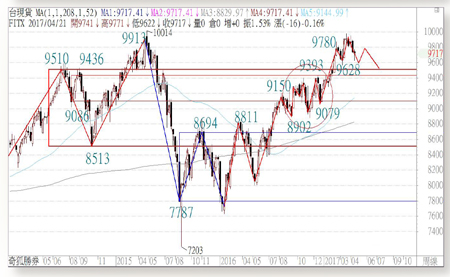 很慶幸自己遇到箱波均,「選擇」真的很重要,好教材是能夠經由複製學習依樣畫葫蘆照做出來才是真的。相較其他不同老師的複雜凌亂學派,有時不能解釋的部分就歸為例外,例外中還有例外,同時還要搭配好多資料與螢幕配合操作,這樣學員該如何操作?箱波均真如我嚮往的哲學:簡單、可操作、放諸四海皆準。國內外不同商品如:海期、原油、匯率、原物料、甚至連總統候選人支持度等,只要能夠畫出線型都能夠分析,一招就讓你隨時隨地可賺錢,C/P值爆高的。認識箱波均之前我從未知道期貨、選擇權是什麼,以為賺錢只有靠上班領薪水一途,幾個月後的現在看到線型就先用簡單兩條線馬上立判出漲、跌、盤再說,一切真要感謝箱波均,這真是一套大道至簡可運作的夢幻工具,持續按照招式九一一耐心等待訊號,以逸待勞,遵守紀律操作,我相信只要堅持下去一定也能成功的。前幾期我們提醒提防台幣的匯損和五月繳稅賣股等因素大盤會有拉回修正的風險,目前剛好打到九六二八出現反彈,需留意反彈不過九八○○到九八六八還會再往下測試九五三六~九五一○~九四三六~九三九三這個支撐帶。由於周線圖的上漲次箱頂重疊在九五一○~九四三六~九三九三,也就是說往下空間大約就五百多點,縱使再弱勢回測年線的支撐,也才回檔不到八百點,因此這邊依然以選股為主要策略,大盤持續以跟去年的八到十一月雷同的模式上下大區間震盪,然而股票卻不斷輪動的行情。
