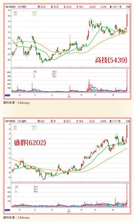 高技(5439):台灣印刷電路板(PCB)專業廠。高技為台灣利基型PCB廠,旗下產品組合為「少量多樣」。高技近年來,密切與電源類相關產品線主要出貨、往來客戶合作,積極搶攻全球電動車市場出貨領域。同時,亦下功夫深耕厚銅製程、Power相關產品已久,目前旗下相關車用產品線包括:AC/DC Charger、電動車與油電混和車相關之DC/AC Converter&Inverter、BMS電池模組等。由於高技電源產品線既有主要往來客戶,除中國自主品牌汽車廠、日系車廠以外,也已成功打入歐、美、中國合資汽車廠等全球各大車廠電源供應鏈。加上,高技主要往來客戶亦高分貝宣示,未來將積極強攻電動車市場,高技已成為電源供應器廠大廠所出貨電源產品PCB板件主要供應商,預料後市很有機會跟隨客戶市占率大幅擴增而明顯成長。由於高技所出貨電源類相關應用產品主要客戶,目前已成功打入歐、美、中國合資汽車廠(日系廠除外)等全球各大車廠電動車供應鏈,預估未來伴隨客戶下單、拉貨量持續增溫下,高技第二季營收業績有望優於第一季五.三億元左右水準。法人機構預估高技今年營收年增率力拼二位數增幅,全年營收預估可達二十一.八億元左右,全年EPS約二.五八元水準。盛群(6202):台灣微控器IC&電腦週邊IC專業廠。盛群第一季因受惠應用於小家電產品之馬達控制、觸控MCU、煙霧感測,以及行動電子裝置快速充電產品,出貨暢旺帶動效應下,營收業績因而得以成功於傳統營運淡季逆勢衝高。不過,因遭受新台幣強勢升值所造成匯損衝擊,使得營收認列主要以人民幣計價為主的盛群,因此難逃匯兌損失衝擊;若扣除匯損影響因素,今年第一季單季營收年增率則可上看達二五%,明顯優於結算公告一九.六%水準。不過,也因為新台幣第一季大幅升值,盛群因此受惠所衍生匯損效應帶來之轉單效益。目前中國MCU、行動裝置快充市場外資廠商,為有效因應人民幣貶值所造成營收縮減衝擊,因此相繼調高產品出貨報價,下游中國家電、行動裝置品牌廠為有效控管製造成本,因此開始將電源零組件訂單轉下單至盛群,盛群也因此接到滿手訂單。第二季營運前景展望方面,盛群預期於馬達控制器、健康量測、小家電、煙霧感測等產品線出貨量有望持續成長,且指紋辨識應用新產品亦將開始出貨下,有機會交出亮眼成績。法人預估,盛群第二季營收業績除可順利優於去年同期水準,也可望比第一季再衝高一成季增率。同時,亦有望成功達陣經營高層原先所設定,全年營收總額成長一○%營運目標。法人機構預估盛群今年營收年增率將力拚二位數水準,全年營收約可達四十四.五億元以上,全年EPS有望達三.六七元左右。