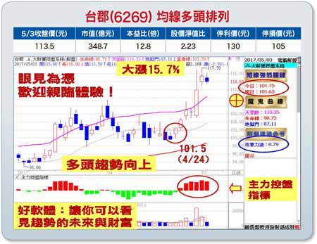 操作建議:台郡(6269)為國內第二大軟板廠,蘋果為最大客戶,佔營收比重八成。主要利基題材有:(1)利空不跌,後市營運審慎樂觀:首季財報受新台幣匯率強升,以及認列三.○三億元匯損影響,稅後純益季減逾七成至二.四五億元,EPS僅○.八七元,第二季因主力客戶新舊產品交替,預估產能利用率與去年同期低於五○%相近,不過,隨著i8拉貨在即,公司表示對第三季起營運提升動能高度樂觀,預期營收將自七月起快速走高。(2)搶下蘋果i8無線充電背板用軟板大單,營運大補:i8在PCB供應上出現兩個重大變革,PCB硬板主板由十層Anylayer的HDI,改為結合載板與HDI製程的類載板,另外則是配合無線充電趨勢,首度在手機後方配有無線充電的背板模組。台郡本身就是iPhone主要軟板供應商,除了前鏡頭、WiFi、側邊等皆需用到軟板外,又新增無線充電背板用軟板,由於單價高、利潤佳,對台郡今年毛利率與整體獲利將有不錯的加分效果。(3)看好i8換機潮爆發,法人力挺:公司表示,下半年因主力客戶新產品設計改變大,目前台郡已拿下無線充電新能源管理軟板成為主力供應商,在光學及無線傳輸等既有產品也因客戶改變設計,採用更細線路產品,主力客戶對公司下半年產能需求較往年強勁,在新產品效益推波助瀾下,下半年產品組合會比去年同期好,預估營運再創歷史新高可期,爆發成長力道強勁。另外,台郡斥資三十億元在台灣興建新廠第三季投產,預計投入先進製程,亦將成為推升今年業績成長一大動能(※基本面資料若有異動,依公開資訊觀測站最新訊息為主)。操作建議:低接不追高,守穩四月二十八日下緣一○五元關卡不破,逢低於天堂路至富貴線之間仍可留意,設好停損停利(詳見附圖說明)。