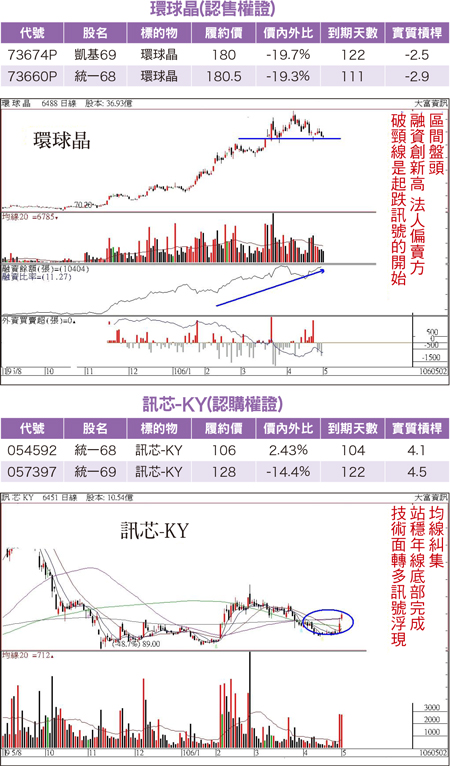 持股部位不同 避險方向相反簡而言之,投資人手中持股很多但是擔心的是股票不漲反跌,此時適合的操作策略就是採取空頭避險,若是投資朋友持股不多或手中都是現金,最擔心的是大盤大漲股票也飆上去,到時候買不到或賺不到,此時的操作策略就是進行多頭避險。兩種方式操作方向相反,我們進一步提出操作方法。空頭避險者的做法:(1)投資人手中繼續持有個股但擔心行情反轉,因此可買進個股的認售權證,這樣就算個股不漲,也可以利用小小的資金操作認售權證,讓認售權證的部位獲利來彌補個股的損失,進而讓虧損縮小。(2)即將進入除權息的旺季,因為投資朋友將來會有配股配息的機會,可是擔心股價屆時會下跌,所以可先買進相關個股較長天期的認售權證,來規避未來除權息時個股或有的棄權賣壓。多頭避險的做法:(1)賣掉手中持股以小資金買進認購權證,這樣可以規避將資金曝露在高檔位置區。(2)空手者滿手現金最怕錯失行情,但是又害怕追高,因此空手者可利用認購權證的操作來避險。個股位階高低 認購、認售權證避險操作以上兩種方式,是以投資朋友手中是以持股還是現金的多寡來區分,不管是多頭或是空頭避險,其實投資朋友都不需要花太多的資金,反而可以避免損失擴大或者錯失獲利的機會,也正好適合目前台股在萬點之際投資人究竟應該進場追價還是要退場觀望的操作策略。這一期我們針對個股的位階高低之分,以個股的權證來掌握多頭或空頭的避險操作,介紹一檔低位階股的認購權證以及一檔高位階有追高風險的認售權證,兩檔不同的股票就蘊含著多頭及空頭避險的操作策略。