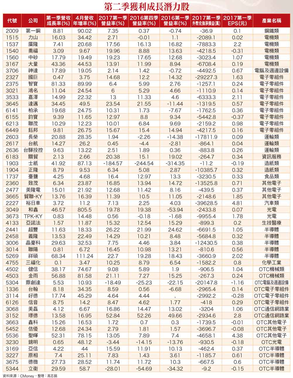 回歸本業表現 從財報內容尋寶畢竟股價反映的是市場對於未來營運前景的預期,由於第一季財報已全數公布完畢,匯損利空也多早已在股價反映,投資人此時不應再圍繞匯損數字打轉。反而要進一步從財報的內容,找尋那些本業營運體質已開始轉佳,卻受業外匯損蒙塵的鑽石。本文針對營益率轉變作為主要的篩選條件,先挑選第一季營益率同時大於去年第四季(季增)及去年第一季者(年增),再配合第一季營收成長及四月營收年增率大於第一季的營運動能增長條件,試圖抓出第二季獲利可能大成長的潛力股(在首季低基期的條件下)。營益率是用來衡量公司本業獲利能力的一項重要指標,是公司每創造一元的營收所能得到的獲利,其公式為營業利益除以營業收入的百分比數字。其中,營業利益是公司營業毛利減去營業費用後的數值。營益率越高,表示公司獲利能力強。反之,營益率越低,就表示獲利能力較低。一旦出現負值,就代表公司本業營運已進入虧損狀態。與毛利率的差別在於:毛利率只考慮生產產品所需要的成本,營業利益率則是包含在取得收入的過程中所耗用的一切成本。當營業利益率發生變化,隱含公司體質正在轉變,例如管理能力提升、新產品效益顯現及達當規模經濟等等,這些轉變均會反映在營業利益率的數字中。根據上述條件,共篩出五十二檔個股,上市有三十六檔,上櫃則有十六檔,以電子股居多,其次為工具機。由此可知,第二季財報黑馬應要鎖定這兩個族群,像是四月營收成長幅度較大的力山(1515)、鈺邦(6449)、致茂(2360)、和鑫(3049)、台翰(1336)、聖暉(5536)、亞信(3169)均可留意。第二季財報黑馬 鎖定電子及工具機族群電動工具代工廠力山,今年健身機新增美國大客戶,三月起產品已開始放量,帶動營收連續兩個月突破三億元,較去年同期成長三成以上。預估隨著人力、產線到位後,年底每月出貨將從目前近千台,一舉拉升至萬台,將是未來重要的營收增長動能。另力山位於浙江桐鄉的新廠已完成遷廠,新廠占地一○三畝,規劃產能較原來的杭州蕭山廠多出一倍。原來占地六十五畝的蕭山舊廠原址,將變更為商業區,當初購地成本每畝約人民幣五萬元,目前仍在與當地政府協商土地售價中,市場傳最快上半年就可定案,增添未來認列業外獲利的利多題材。