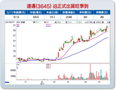達邁營運看好一季優於一季 法人上調目標價、獲利預估達邁(3645)為國內PI膜領導廠商,全球第四大PI廠,PI為一種特種工程材料,在電子產品應用上,用於介電層可進行層間絕緣,作為緩衝層則可以減少應力,提高成品率。達邁產品主要應用在軟板,目前利基型PI(黑色、白色、透明、石墨片、薄型等)佔整體營收比重七○~七五%,其中黑色PI主要供應給美系客戶,去(二○一六)年市占率明顯提升,帶動第三季營收規模創新高,去年全年EPS為一.七六元,配息一.二元。長期營運,看好透明PI及石墨貼片,並認為在可撓式產品需求提升下,有助於擴大透明PI取代玻璃機殼,拓展PI應用面。因為達邁在台灣主要客戶為台郡,所以可說是泛蘋概股,加上打入中國最大品牌手機廠華為供應鏈,今年第一季可以說是淡季不淡,第一季財報公布,達邁EPS為○.五七元,毛利率三七.二八%,皆優於市場預期。四月營收一.五億元,月增四.一五%,年增四九.五%,五月蘋果i8開始出貨台虹,台虹之後再給台郡,因此預估第二季營運將優於第一季,第三季傳統旺季將很旺。在五月十二日法說會後,法人已紛紛上修達邁今年獲利以及波段目標價。二○一七年EPS也從三~三.五元上修至三.七四~四元,可望創下掛牌以來獲利新高。