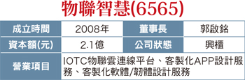 「TUTK」打入大陸通用OE市場今年起,旗下子公司推出自有品牌產品,以「Powered by Kalay」的Kalay Home系列產品─智慧照明攝影機及香薰智慧水氧機為先發,預計第三季各大虛實通路上架販售。面對激烈競爭的影像監控市場,郭啟銘強調,將結合上游IC業者,佈局新世代產品,並提供多元的影像應用及服務,以拉開與競爭者的差距,未來也將於Kalay平台導入臉部辨識、機器學習等功能,結合市場主流的服務與應用,採合作對接方式導入既有的影像設備客戶。去年第四季切入車聯網領域,提供車載後裝系統影像輸出技術,並與電信商建立合作關係,郭啟銘指出,TUTK去年打入中國上汽通用品牌前裝(OE)行車紀錄器,下一步將導入更多平台影像應用,同時進入汽車後裝市場朝智慧工業應用進行研發。雙引擎成長動能 營收再戰新高物聯智慧目前股本二.一億元,二○一五年營收一億元,稅後虧損一.三五億元,每股稅後虧損七.一六元;二○一六年營收一.五三億元,稅後虧損一.一億元,每股稅後虧損五.三五元。隨著智慧家電逐漸普及,物聯產品市場規模發酵,物聯智慧去年十二月單月營收一六五二萬元,年成長六六%,郭啟銘樂觀預估,今年在自有品牌及車聯網雙引擎發動下,有機會挑戰營收新高。