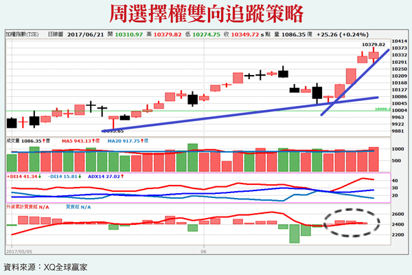 A股正式納入MSCI新興市場指數,生效日在二○一八年六月,這代表中國的金融市場朝國際化更邁進了一步,盼了三年多,這一次終於讓A股如願以償,當然這一功績自然也會被算到現任的中央政府上,對於後續的十九大也會有所影響;不少人都在討論MSCI納入A股後市場資金在分配上的問題,但這是一年後的事,市場資金立即要面臨的,是九月份美國聯準會的縮表政策。在這一波鴻海強勢拉抬帶動下,台股加權指數六月二十一日再創波段新高來到一○三七九點,當日同樣是台指期六月合約的結算日,期貨指數也在多頭強勢推動下順勢拉高結算。只是,從六月十六日台股起漲以來算到二十日,外資累計買超僅僅只有六十七億,加上美元兌換台幣匯率從六月初以來,便一路從三○.○持續貶值來到三○.四,顯示外資立場並未隨著麥格理兩百多頁的鴻海報告而轉向積極。配合技術指標來分析,DMI指標開口快速擴張,+DI維持大於-DI,且ADX繼續上揚,顯示多頭的盤勢主導權持續增強,接著從籌碼來觀察,十六日外資在台指期的淨多單為五萬八千口,多單加碼近三千口,法人立場維持偏多,可以溫漲策略(買權多頭價差)來觀察。