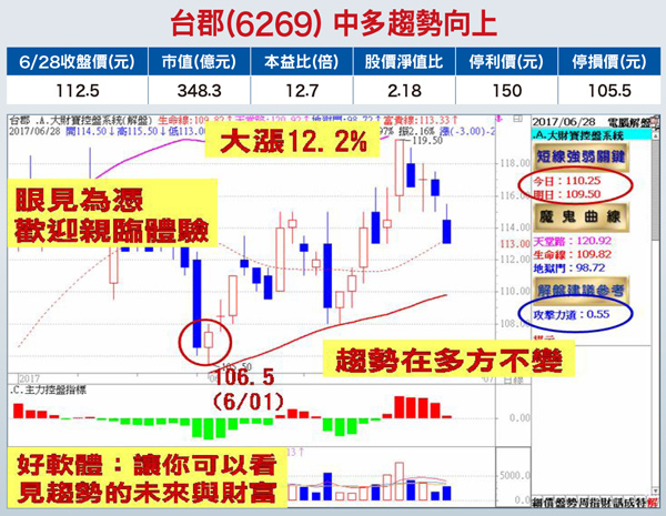 【個股推薦】台郡(6269)為蘋果台系三大軟性印刷電路板供應鏈之一,蘋果佔營收比重八成。主要利基題材有:(1)蘋果i8拉貨啟動,營運將開始往前衝:歷史經驗顯示,每年蘋果新品發表,蘋概股也開始逐步加溫,以台郡去年營收表現來看,六月營收較五月微幅成長,從七月開始,隨蘋果拉貨啟動,營收快速攀升,七月較六月增加二八.二三%,八月又較七月成長三○.八七%,九月及十月則繼續向上。今年也不例外,尤其這一次在手機功能提升或整體銷量預期均更勝往年,其營運爆發成長力將會非常強。(2)i8軟板用量增,營運大進補:隨著蘋果i8功能大舉提升,軟板用量增加,加上十周年大變革,市場高度期待,預期整體銷量將更勝往年。台郡成功搶下i8無線充電背板用軟板大單,產品單價高,利潤佳,對台郡今年整體毛利率及獲利率大大加分。財務長熊雅士也表示,下半年因主力客戶推出新品設計改變大,在光學及無線傳輸等既有產品也因客戶採用更細線路,主力客戶下半年產能需求較往年強勁,未感受到需求有延後跡象,預期在新產品效益推波助瀾下,下半年產品組合會比去年同期更好,甚至營運及業績成長爆發力將更勝於去年。另者,台郡投資三十億元在台灣興建的新廠第三季投產,預計投入先進製程,亦將成為推升今年業績成長一大動能。配合籌碼面與技術面處於相對有利位置,後市行情值得高度關注(※基本面資料若有異動,依公開資訊觀測站最新訊息為主)。【操作建議】低接不追高,守穩前低一○五.五元關卡不破,逢低於生命線或富貴線附近仍值得留意,在趨勢走多且控盤指標翻紅不變下,一旦攻擊力道順勢轉強,隨時有噴出大漲可期,設好停損停利(詳見附圖說明)。
