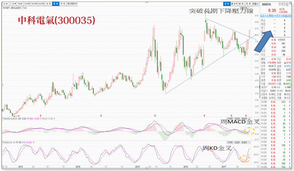 中能電氣挑戰長期下降壓力線 中科電氣日周月KD同步助漲另外,市場正在猜測與等待到底哪一家企業可以跟特斯拉合資共同發展新能源車的同時,中能電氣(300062)傳出擬設立合資公司提供新能源車租賃及充電服務,並且覆蓋雄安新區,六月二十六日股價應聲跳空大漲直奔漲停板,站上季線十一.八元壓力,日周KD金叉助漲,有機會在十年均線的十一.三四元附近形成九周的小W底,後續有機會挑戰長期下降壓力線的十四元壓力。還有屬於特斯拉相關的鋰電池板塊當中的中科電氣(300035),公布二○一六年利潤成長四八%,擬十轉十派一元的預案,同時搭上中低速磁懸浮高鐵的題材,不僅中國各地有很大的鋪設空間,還有一帶一路的沿線國家的高鐵輸出想像空間,雖然市盈比高達九十九倍,但技術面正好用兩根大陽線突破長期下降壓力線,日周月KD同步助漲,可追蹤。