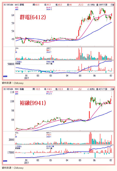 群電下半年旺季效應 稼動率升群電(6412):群光(2385)旗下電源供應器大廠,持股約四七.八三%。公告六月營收二六.八三億元,月增二四.六%,年增一五.六%;一至六月累計營收一二八.七億元,創歷史新高,年增一○.二%。法人機構預估受惠消費性電子產品如遊戲機、智慧家庭等內建電源供應器出貨量成長下,群電第二季營收有望維持五~七%年增率;業外匯損可望因新台幣走貶而收斂,推估第二季稅後獲利約可小幅季增達二.四億元左右,EPS約○.六五元。法人預估在部分競爭者退出市場下,群電今年於PC市場客戶滲透率有機會進一步拉升,日系遊戲機廠客戶市占率亦有望走高,下半年旺季營收仍具一定強度成長動能。由於旺季效應可有效提升產線稼動率,且產品出貨組合亦將持續優化,法人預估群電毛利率仍有機會較去年同期一七.七~一八.三%水準成長,營收預估約可達三○六.五億元以上,年增約一一.八%,EPS約四.三五元。中國業務高成長 裕隆EPS上看七元裕融(9941):公告一至五月累計營收七七.九七億元,年增八.一六%,獲利九.二五億元,EPS達三.三七元。同時,預定七月二十六日發放四.八一元現金股利。裕融進軍中國融資租賃市場布局有成,中國子公司裕隆汽車金融今年首季於中國汽車融資市場,融資承作件數已多達五千件,市場看好今年有機會交出單季破萬件佳績。裕隆汽車金融第二季由虧轉盈機率高,全年有望挹注母公司裕融獲利貢獻。裕融為台灣裕隆集團旗下融資租賃公司,台灣主要營業項目為汽車分期付款與融資業務,中國市場業務包括:格上租車、裕融租賃、裕國融資租賃等轉投資子公司。裕融租賃主力業務為設備租賃,客戶多為中小型企業,以「CNC新機台」租賃為主。去年新成立裕國融資租賃,主要從事二手車分期融資。去年四月裕融獲中國官方發給「汽車金融租賃」特許執照,後續將於裕國所奠定基礎上持續擴大汽車金融租賃業務。法人看好中國裕隆汽車金融業務成長強勁,今年本業亦有望穩健成長,預估裕融今年營收約可達一九七.四億元,年增約一二.三%,稅後獲利有機會達二十億元,EPS約七.二元。