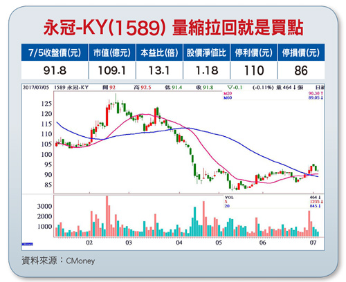 永冠-KY(1589)是鑄件大廠,主要從事球狀石墨鑄鐵、灰口鑄鐵之鑄件製造,屬於金屬二次加工業者,主要產品之原料以生鐵及廢鋼為主,佔成本約五成。永冠-KY以客製化造模方式製造產品,主要應用包括生產風力發電機材料的齒輪箱、底座、軸承座等,產品應用營收比重為:能源類佔四二%、注塑機佔二七%、產業機械佔三○%。過去永冠-KY所生產之風電鑄件主要銷售給中國大陸(約佔六成),但在二○○八年中國大陸廠商競相投入後影響公司的獲利,於是永冠-KY將事業版圖慢慢轉往歐美市場發展:中國大陸佔三五%、歐洲佔三二%、美洲佔二三%、亞洲佔一○%。永冠-KY於去(二○一六)年收購上海機床鑄造一廠(上海鑄一),以生產能源類鑄件為主,今(二○一七)年已開始試產,下半年將可逐漸提升產能效益,隨著新廠產能開出和新客戶比重增加,永冠-KY最壞的情況已經過去。此外,行政院核定推動的「前瞻基礎建設計畫」中,有關綠能建設的「風電四年計畫」,預計二○一七至二○二○年新增652MW(百萬瓦)風電目標量,二○二五年完成4.2GW目標(陸域1.2GW+離岸3GW),預估可促成六一三五億元的投資額;對於生產離岸風力發電之大型鑄件的永冠-KY而言,可望直接受惠。