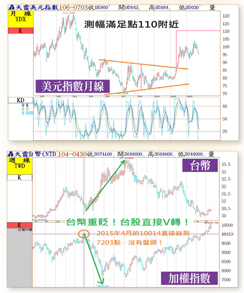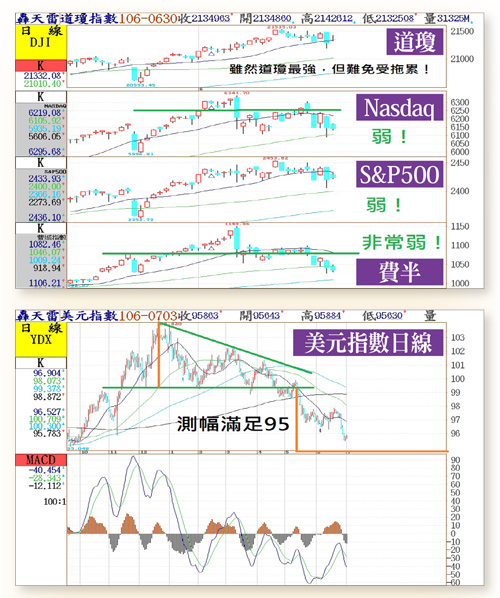 美股指數近期呈弱勢回檔格局,原則上除了道瓊還守穩在月線上,其餘包括費半、那斯達克及S&P500這三大指數,最強的都已經跌破月線支撐,且可明顯發現月線都在下彎中。從扣抵值的角度觀察,未來一個月是美股的危險期,也就是非盤即跌,除非科技類股有更大的利多可刺激五大科技權值股,如:Apple、Google、FB、Amazon及Netflix等股價向上反映利多,否則最強走勢就是盤整。美元指數南進政策?另外在美股中值得留意的就是美元指數的表現,反映目前市場對於FED升息及縮表的看法,短線跌幅滿足點在九十五附近,長線型態來看,則還在長線多頭整理架構中,對照未來FED要縮表及升息的政策,美元指數終究還是會向上表態,只是時間早晚問題。簡單來說,市場資金到最後還是會緊縮,只是現在大家選擇忽略,據統計,FFD在升息循環中,要升息超過三次以上,才會讓市場真正有感覺到資金緊縮,為何會這樣?就是政策的遞延效果所導致,因此,當FED正式宣布縮表時,市場應該就會更有感。資金退潮直接V轉至於與美股亦步亦趨的台股,當然也會有所反應,尤其外資目前在台股占比逾三五%,只要外資撤退,台股立馬會受影響,重點是千萬不要以為台股會有時間來盤個頭或什麼的,記得二○一五年四月到八月底的股災嗎?台股幾乎是V型反轉向下,就因為資金快速撤離。因此,當未來美元指數再次回升時,新台幣貶值壓力之下,外資肯定會大幅出走,因為匯率成本太重,屆時,不計價出現的賣壓將會讓投資人反應的時間都沒有。只是這些都是後話,現在要觀察的是台股能否回補在高檔所留下的空方缺口。