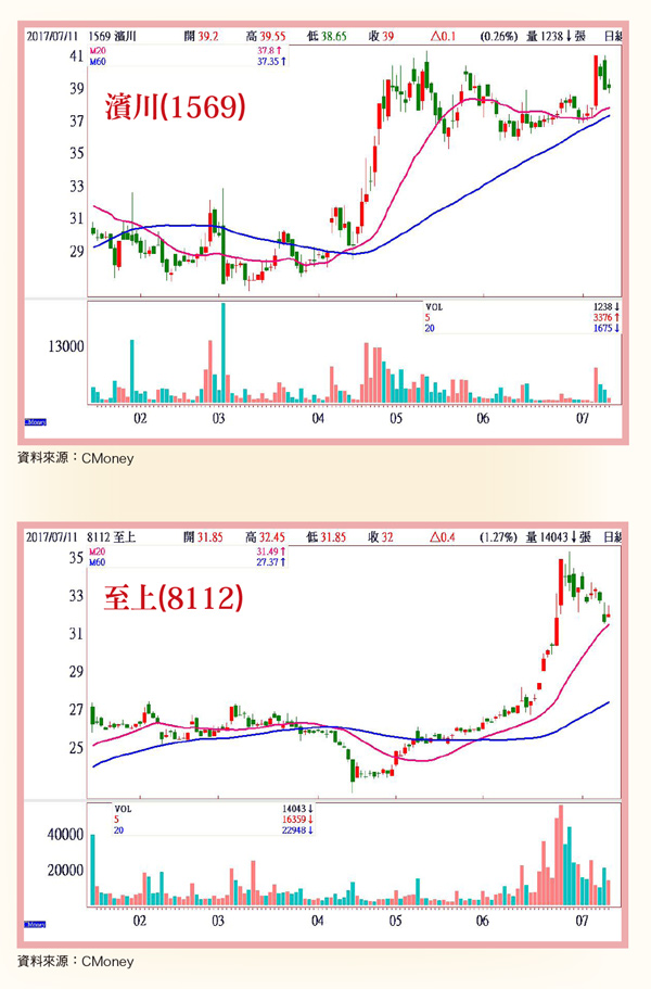 濱川美、中市場訂單優於預期濱川(1569):公告六月營收三.二二億元,月增二○.六七%,年增率高達四七.九四%;一至六月累計營收十六.三二億元,年增率達四八.七六%。濱川近年來浮現營運轉機,去年起積極調整體質、提升產線良率,在陸續接獲中國、美國筆電廠客戶訂單後由虧轉盈,終結連三年虧損,全年EPS達一.九四元。濱川表示,原本去年底延遲交貨的訂單今年第一季已順利出貨,營運得以淡季不淡,毛利率亦未受匯損影響,營益率有一三.一○%好成績,甚至一舉創下十個季度以來新高紀錄,單季EPS○.七四元。六月營收交出三.二二億元佳績,年增高達四七.九四%,一至六月累計營收年增率已超過四五%。法人預估,因中國客戶第二季新產品上市,濱川提前出貨、進入營運旺季,營收可望持續挑戰八億元關卡,單季EPS上看一元水準。下半年進入傳統旺季,加以中國、美國市場訂單量優於預期,CNC產能有望拉高二五%。法人機構預估濱川今年營收約可達三六.七○億元,年增約二八.九五%,EPS約三.九一元。至上受惠陸手機廠衝刺出貨至上(8112):快閃及其他記憶體(營收占比三五.八○%)、液晶顯示面板(營收占比二四.三八%)、手持式裝置應用晶片(營收占比一三.九三%)、動態記憶體積體電路(營收占比一三.一九%)、系統IC(營收占比五.四五%)電子通路廠,公告六月營收九八.○六億元,月減一二.四○%,年增四.五三%;今年一至六月累計營收總額五六五.四六億元,年增二○.三五%。至上營收自二月以來穩定走揚,二月營收八二.七億元,三月達八七.二億元,四月逾九十九億元,逼近百億元關卡。五月合併營收達一一一.九四億元,成功站上百億元大關,創歷年單月次高。至上受惠三星面板、記憶體出貨暢旺,五月起提前步入旺季;隨著DRAM、NAND Flash報價持續走升,預料至上業績可持續暢旺。第二季合併營收已達三百億元以上,優於第一季,市場預期第三季有機會更上一層樓。法人表示,在庫存調整逐漸接近尾聲下,預估中國手機品牌廠下半年將開始衝刺出貨量,有望帶動至上記訂單,營運成長動能可期下,預期後續獲利可望順利走高。法人機構預估至上今年營收預估約可達一二一五.四六億元,年增約九.一五%,EPS約三.八一元。