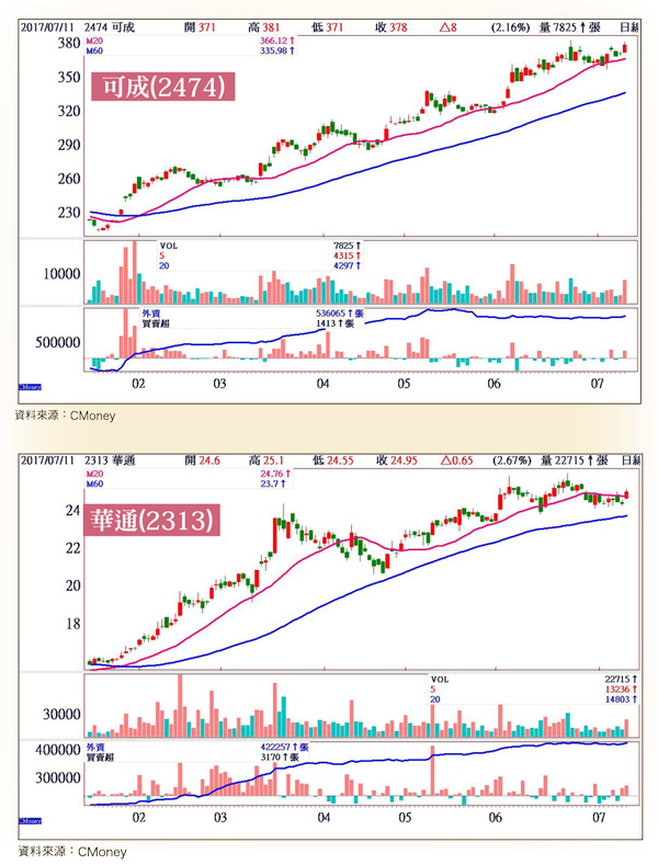 撰文的今天(七月十一日),指數大漲一二五點,股王大立光(3008)再創了新天價,鴻海(2317)回神,台積電(2330)回神,這三檔台股的支柱,六月營收表現皆相當亮眼,帶動了市場的多方氣勢,有趣的是前幾個交易日,加權指數還弱弱的回測月線下,結果一根長紅K上來,確立止穩,再次進入橫盤格局。仔細觀察其中內外資動向,可以發現到官股自七月三日至十日共買超將近八十二億元,七月十一日指數大漲逾百點,官股大獲全勝,而本波外資受制於美國科技股近期的疲弱,採取較多賣超的動作。蘋概股六月營收亮眼不過此一情況將隨著費城半導體指數連兩日長紅於七月六日至十日站回季線後,外資對電子股的賣壓料將減輕許多,接下來要持續觀察費半指數是否能站好站穩季線,若能,則科技股的危機將暫告一段落。接下來七月中之後的重頭戲將落到蘋果,雖然外界雜音很多,一下說延後,一下說史上最貴,一下說出貨不順之類的,這感覺就好像去年的i7一樣,雜音很多,但到了後面賣得還是相當不錯。而i8延後上市約一個月左右的時程,但這並不是什麼大的問題,因為從大立光、台積電、鴻海三大蘋概股的六月份營收亮眼,即可明白i8的威力,縱使以上三檔股票因為i8延後上市而造成第三季財測調降,但只要度過了這一段時間,營收早晚都會出來。看看美國的Apple股價,從一五六美元跌到一四二美元,這樣的一段跌勢,讓很多投資朋友因此看衰蘋果,但近期的Apple股價已經回穩,如果真的i8很差,你就不會看到大立光一直創新高了。快充、無線充電、類載板 下一代手機新主流 以下幾檔蘋概股可多加留意:一、多方技術面強勢的如可成(2474)、和碩(4938),此兩檔蘋概股,在本波指數一度回測到月線的過程中,皆呈現橫盤的高姿態整理,可成一度回測月線,和碩僅回測到十日線,而先前上攻過程中,也未見到高檔有爆量長黑的敗象,可沿月線向上操作,待見到外資連續大賣再行退場觀察。二、充電:快充與無線充電已成為新一代智慧型手機的趨勢,預料新一代的蘋果手機也將採用,這個產業成長趨勢已相當明確,這一點從專攻充電的昂寶-KY(4947)以及敦南(5305),兩檔的六月營收皆創下歷史新高即可得知,而敦南也屬蘋概股的一環,接下來七月進入正式拉貨期後,營收成長可期。三、類載板:華通(2313)、景碩(3189)、台郡(6269),目前來看類載板,將是明年新一代手機的新主流,而i8 OLED版本將會採用類載板,目前尚未明確的是i7s以及i7s Plus是否會跟進,若跟進探用類載板,則相關廠商營收爆發的時間會提早,若未採用,則爆發時間會延後,但由於已經是接下來新一代手機的新趨勢,所以早成長晚成長都會成長。其中以景碩五月的法說會為例,公司表示,新豐廠的新產能預計在六月底投料,這一點與i8延後上市供貨的情況不謀而合。