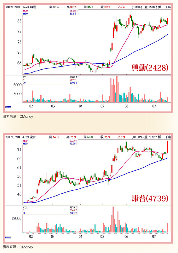 興勤滿手訂單 獲利挑戰新高興勤(2428):被動元件廠,公告六月營收五億元,月增三.七八%,年增八.六○%;一至六月累計營收二八.二一億元,年增一○.九四%。興勤認為目前被動元件正處於景氣循環好轉階段,需求轉佳。對興勤而言,去年為自谷底翻升階段,今年逐步好轉,明年有機會更上一層樓。興勤表示,因中國常州新廠已完成建置,未來產能增加幅度,將視人員訓練、生產線良率及效能提升速度而定,預料後續營收增幅較有可能呈現溫和成長態勢。興勤指出,今年以來由於3C消費性電子產品提高對保護元件重視度,加以產品效能不斷提升,增加保護元件需求量。同時,物聯網、車用電子市場也增加對電子元件的大量使用,進一步拉高需求量。目前接單狀況滿手,產能已達滿載水準。法人原先推估興勤第二季營收可逾十四.五億元,最終結算為十四.七九億元,季增一○.一七%,毛利率雖小幅下降,但因獲業外遷廠補償金約二.六億元,EPS貢獻度約二元;第二季整體EPS推估可上看三.六元,上半年EPS可達五.二元。法人預估興勤下半年本業營運仍暢旺,今年營收預估約可達五九.三五億元,年增約九.七四%,EPS約八.三四元,改寫歷史新高。康普斥資擴產電動車電池材料 康普(4739):動力電池材料(營收占比三○.二六%)、化學肥料(二一.六八%)、氧化觸媒(一三.三八%)廠,六月營收三.六六億元,月增一.三六%,年增一七.二二%,一至六月累計營收二三.五九億元,年增二一.三○%。特斯拉原本動力電池模組供給不足壓力六月份已獲有效解決,第一批三十輛Model 3預定七月二十八日正式交車,後續規劃九、十二月單月產能目標將各別提升達一千五百輛、二萬輛,催化動力電池材料供應台廠康普後續業績成長動能看好。康普第一季營運受惠國際鎳價一度大漲一八.七一%而走揚,EPS一.二八元,創近四季以來新高,季增率高達四.九二倍;前六月營收二三.五九億元,年增率逾二成。因應電動車電池材料市場需求持續擴大,康普已投入達六百萬美元資本支出,於苗栗頭份開設第三條電池材料「硫酸鎳」產線,規劃月產能由一千二百噸擴增達二千七百噸,預定第三季投產。營運動能穩步加溫下,市場人士預估康普下半年業績成長可期。法人預估康普今年營收約可達五一.六九億元,年增率約二九.四三%,EPS約三.九一元。