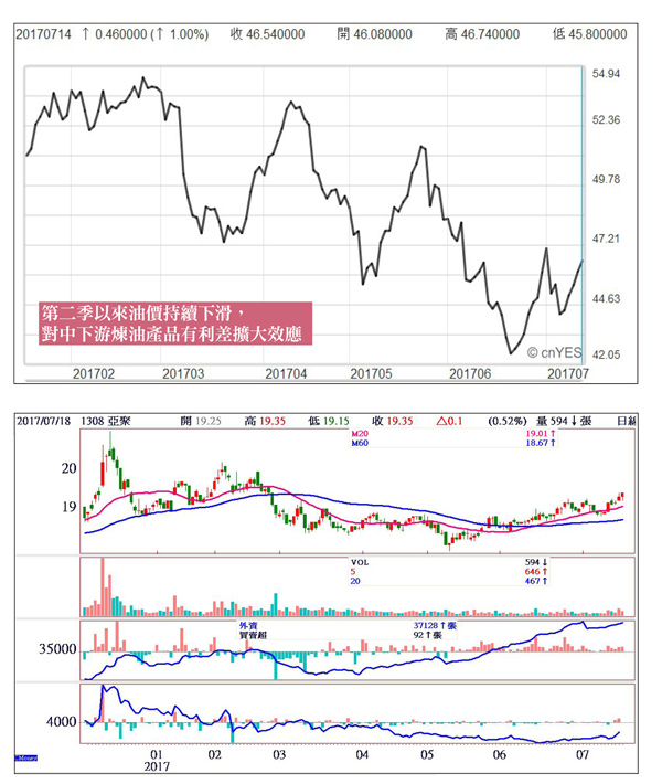 鈷價漲 康普、美琪瑪營收成長另外,如電動車需求以及電子進入旺季,國際鈷價第一季大漲後再續漲,以倫敦金屬交易所(LME)的報價走勢圖來看,今年初的鈷價才約一公噸三萬三千五百美元,七月十七日已經漲到五萬七七五○美元,漲幅高達七二%,反映成本後具漲價效應所帶動出來的PTA氧化觸媒和鋰電池正極材料,也讓台灣的康普(4739)與美琪瑪(4721)營收持續成長,表現亮眼,這也是需求帶動的漲價。另外,從成本下滑帶動的利差效應來看,第二季的平均油價較第一季下滑三至四美元,以最新中油石化基本原料現貨報價,調降六月乙烯及丁二烯合約供料價,降幅各為一二.五%、一九.一%,下游衍生品如乙二醇(EG)、苯乙烯(SM)止跌走揚,有助於下游煉品附加產品廠等廠商利差上升。國喬、亞聚 受惠原料成本下滑其中如國喬(1312),第二季營收五五.七億元,年成長二二.七%,ABS利差創下五年新高,本益比目前還不到八倍。亞聚(1308)第二季營收十五.六五億元,年成長二一.八七%,同樣受惠於原料成本下滑利差擴大效應,四月以來,外資天天買超,累積四五六七張,期間融資減少二五七張,籌碼相當穩定。