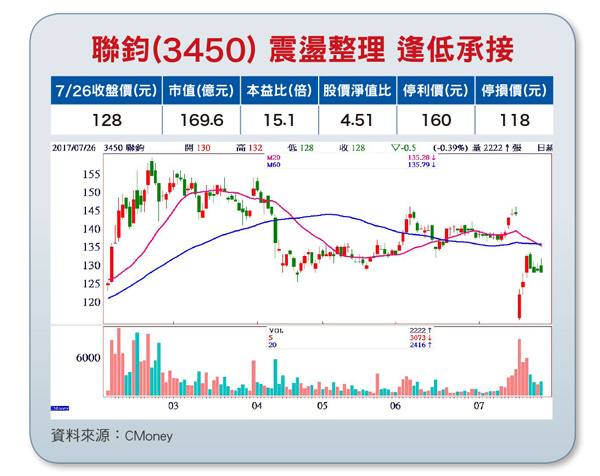 聯鈞(3450)為全球前三大高階專業雷射二極體封裝測試廠商,產品應用包括光資訊、光通訊與光檢知等三大領域。鐳射和光電元件是聯鈞的核心技術,聯鈞從光儲存、光通訊,再到體感,成為光電元件中的佼佼者。聯鈞近幾年謹慎擴產、設備折舊攤提已近尾聲,加上應用於基地台、資料中心及4G、5G等新產品布局如預期成長,公司業績相較於同業來說更為穩定。展望下半年,雖然中國大陸2.5G光通訊需求持續疲弱,不過資料中心需求爆發,10G PON需求也持續向上,尤其是手機感測應用滲透率將提升,聯鈞具備技術與產能規模優勢,預期第三季年增率將轉正。操作建議聯鈞光資訊產品的新案已在今年第二季開始出貨,第三季來自這一部分的營收將大幅提高,有助於拉抬第三季業績,而子公司合均專注在雷射COB製程封裝,也於去年底開始受惠消費性應用成長,公司已啟動擴產計畫,迎接新訂單。此外,由於VCSEL雷射被運用在蘋果新手機的3D感測光源,台廠中目前相關個股以穩懋(3105)、聯亞(3081)及聯鈞最具優勢。再者,光通訊中具有10G PON優勢者有聯亞、眾達-KY(4977)、聯鈞,其中聯亞及眾達近期股價皆已領先大漲,因此聯鈞值得逢低留意。