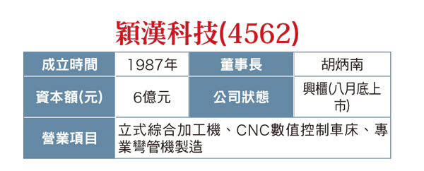 「沒有跟上,就等著被淘汰」「沒有跟上,就等著被淘汰」,胡炳南指出,事實上,德國工業4.0平台秘書長邦廷(Henning Banthien)也曾說,「不改變,幾年後你的公司就等著關門大吉。」早早看到趨勢,穎漢除固守城池外,勝出關鍵更在「與時俱進」,胡炳南指出,「當其他廠商都退出市場,我們則繼續往前,學習C語言(通用的程式語言,廣泛用於系統軟體與應用軟體的開發)、培訓人才,十多年來跟汽車產業一起成長。」相較過去傳統工具機發展,與現在以目標導向為主的不同設計方式,穎漢加入數位製造流程減少人力資源串連機械手臂,把多個製程連結起來導入自動化,視工作需求,彈性調整單機、雙機或整體工作站運作模式,此系統可容許設定多達二五五組以上程式選單 (MENU) ,快速選擇要執行的工作程式,輕鬆改變工作站製程,由於導入性價比高,未來將走向全面自動化,達成關燈工廠目標。穎漢目前股本六億元,根據合併財報,二○一五年營收一一.九三億元,稅後淨利一.六七元,每股稅後盈餘(EPS)二.八二元;二○一六年營收十三.九一億元,稅後淨利一.六四億元,EPS二.七一元;二○一七年上半年營收七.一一億元,較去年同期成長二三%。展望未來,大陸打出「一年興建一條高速公路」的速度,在基礎工程高速增溫下,將間接帶動大車需求,此外,看好未來電動車及新興市場,胡炳南表示「我們已經準備好在等待客人上門」,做好周全準備,穎漢蓄勢待發,預計八月底上市,後市備受市場期待。