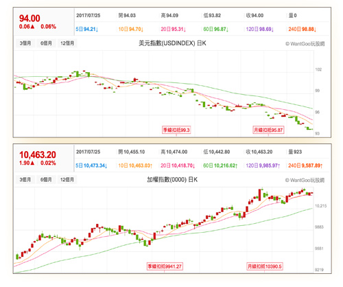 美元指數趨軟 台股走勢相反大盤雖然沒有每天繼續往上噴,但是整個多頭結構都還是很完整,極短線看是多空都有機會,把時間軸稍微拉長一點點看的話,還是多方佔優勢,這樣看有兩個主要的證據支撐:1.整個大盤都還是呈現均線多頭排列,均線多頭排列的影響就是指數修正的時候,都會一直有人逢低買進形成支撐;2.美元指數持續下跌,現在已經破底了,我之前有教過你一個觀察台股的技巧:通常美元指數跟台股的走勢是相反的。因為台幣升值,美元貶值,代表外資持續匯入台灣,匯入台灣現階段總不會是要炒房地產,那就只有買股票一條路了,所以籌碼活水是源源不絕的。看美元指數跟台股大盤的對照圖,是不是一個跌,一個就漲如果你看到期權籌碼似乎沒像之前這麼偏多,覺得有點擔心的話,建議你把目光去注意另外一個點,最近上櫃指數走勢比大盤還強,大盤還在高點附近震盪,上櫃已經領先創下波段新高,上櫃股票裡面也很多創波段新高。所以雖然外資前兩天股期雙賣,但是現階段的操作方向還是偏多,但是操作方式要調整一下,原本是以操作上市股票或是指數為主,現在調整為以上櫃中小型股票為主。像本週二也是類似的狀況,大盤上漲○.○二%,但是上櫃指數漲○.四九%,上市櫃的股票總和淨上漲家數五成左右,所以你選股從上櫃來選在現階段一定是勝率比較高的,要選到強勢股也比較容易。 月線季線往上走 沒道理看空單純看大盤也還是偏多沒錯,月線跟季線都持續往上走,就算遇到修正,十之八九也會反彈,所以這裡沒道理要看空。結論有兩個:1.現在還是偏多操作,遇到修正進場,保持不追高的好習慣,你就不用擔心受傷;2.把目光從上市股票移到上櫃股票,你會發現新大陸。小結一下,大盤極短線多空都有可能,不好預測,但是稍微看長一點,暫時還是多頭佔優勢。