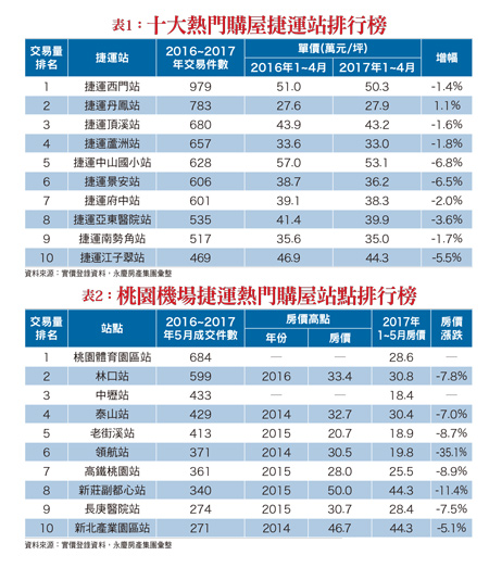 交通建設往往為區域房市帶來助漲行情,然而在房價修正的浪潮下,連過去有票房保證的「捷運宅」,光環都不再,根據永慶房產集團調查,十大熱門交易捷運站的房價都呈微幅跌勢,但為何捷運宅還是民眾買房的熱門選項之一?房仲業認為,捷運宅雖難敵修正命運,但交通的便利,仍吸引通車族「逐捷運而居」,捷運宅仍有一定的魅力。消費者青睞捷運站 十站有九站跌永慶房產集團根據實價登錄資料統計,各捷運站自二○一六年至今(二○一七)年四月間交易量的十大排名,西門站以九七九件居冠,其次則是丹鳳站的七八三件與頂溪站的六八○件。永慶房產集團業管部資深經理謝志傑表示,若以捷運線來看,中和新蘆線就有六站進榜,堪稱最受民眾購屋青睞的捷運線。但就房價表現部分,十大捷運站除了丹鳳站持平外,其餘站點房價均走跌,跌幅在一.四%至六.八%間(表一)。謝志傑表示,捷運已成為台北人不可或缺的大眾運輸工具,民眾購屋時,交通便利與否也是重要考量因素,鄰近捷運站就是一大賣點,加上捷運站周邊商業機能發展成熟、生活機能完善等優點,頗受民眾青睞。不過,在新案破盤搶市的情況下,讓利成風,比價效應發酵,「捷運宅」也難逃跌價浪潮,目前「以價換量」仍是市場主調,這也是十大熱門捷運站價格走跌的主因。房地產開發商指出,在過去,「捷運宅(距捷運站約十分鐘腳程內)」是房價的票房保證,只要是捷運站周邊的建案,預售時,不僅每坪房價都比一般地區的房價來得高,就銷售速度來說,也比較快完銷,但現今的氣圍已不比從前了。捷運機場線生不逢時 房價也回檔造成「捷運宅」從過去的搶手,到如今,隨著房市拉回整理而出現房價下跌的情況,最明顯的還有「捷運機場線」,通車時間可說是「生不逢時」。