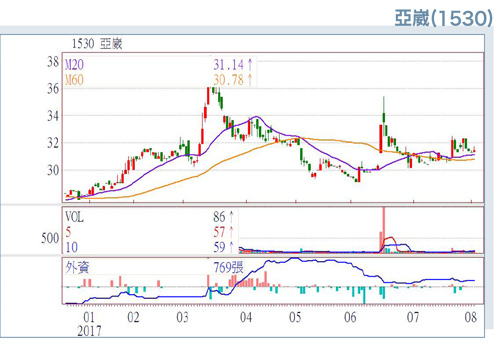 在iPhone 8將帶來超級循環的預期下,推升台股蘋概股持續飆漲,累計今年科技股漲幅已達二一%,遠優於大盤的一四%與非科技股的五%。已有法人出具報告示警,未來將慎防科技股利多出盡或基本面不如預期,觸發市場獲利了結賣壓,或導致資金輪動至非科技類股。另考量加權指數也來到前波高點,壓力將會逐漸加大,操作上似乎不宜再追逐「天上飛」的科技股,「地上爬」的傳產股反而是相對安全的選擇。受惠第二季台幣兌美元持穩及兌歐元、人民幣雙雙貶值,第二季認列匯兌收益一~二千萬元,工具機廠亞崴(1530)第二季EPS回升至○.六~○.八元,順利虧轉盈,扣除第一季虧損○.二五元,上半年應有○.三五~○.五五元。亞崴目前台灣在手訂單約十六億元,大陸廠接單四~五億元,訂單能見度至第四季無慮,除汽機車需求穩定外,來自中國自動化需求包括模具製造、設備汰換帶動五軸智能機台下單量增外,航太、船艦、基礎建設、重工等訂單持續增加。除中國外,來自韓國包括半導體設備及光電產業所需的綜合加工機及龍門機需求量增加,預估今年韓國地區營收佔比將由去年的一~二%提升至五~六%。隨著川普積極推動美國製造,近期來自美加地區汽機車及航太所需的機台下單量開始增加,加上反應零組件成本上揚,第三季報價已是今年來第三度調漲,漲幅約五~一○%。亞崴斥資人民幣四~五千萬元擴建中國吳江廠二期新廠,預計在十月底動工,年產值新增人民幣二億元,規劃二○一八年底前量產,增添未來營運成長空間。