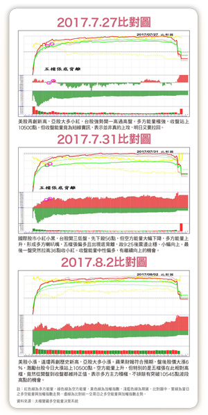 台股自六月二十七日見到一○五四五高點後,便進入高檔強勢區間整理。上周四(七月二十七日) 美股再創新高,亞股大多小紅,台股強勢開一高過高盤。多方能量極強,收盤站上一○五○○點。但收盤能量竟為短線賣訊,表示並非真的上攻,次日又要拉回。上周五(七月二十八日)台股果然中黑回檔,低點還跌破上周四低點。道瓊拉高創高,科技股下跌,費半大跌一.六%,韓股也大跌一.六%,台股開三低盤,直接下探月線。收盤能量為短線賣訊,且賣訊增強,表示大盤仍有低點。我在上周五FB「能量教室」盤中解析,即預告周一很可能下探一○三六八~一○三八一點或以下,也預告那將是另一次買點。本周一(七月三十一日)國際股市小紅小黑,台股開三低盤,先下殺五十六點,低點果如預測來到一○三六六點。空方能量大幅下降,多方能量上升,形成多方喇叭嘴,五檔張偏多且出現底背離,故九點二十五分後震盪止穩、小幅向上,最後一盤突然拉高三十六點收小紅。收盤能量中性偏多,有繼續向上的機會。八月一日美股小紅小黑,但電子盤上漲,台股開低十八點,但多方能量強勁向上,形成多方喇叭嘴,五檔張偏多,故開低走高收紅。收盤能量依然中性偏多,還是有續漲的機會。八月二日美股小漲,道瓊再創歷史新高,亞股大多小漲。蘋果財報符合預期,盤後股價大漲六%,激勵台股大漲站上一○五○○點。空方能量上升,但特別的是五檔張在此相對高檔,竟然從開盤到收盤都維持正值,表示多方主力積極,不排除有突破一○五四五點波段高點的機會。