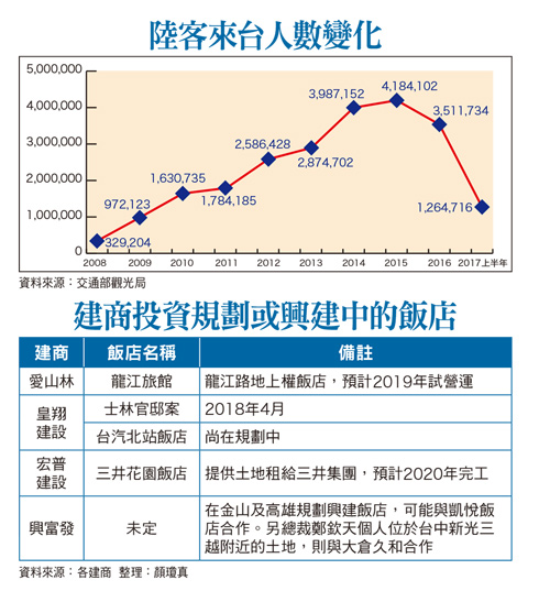 七月二十七日是個好日子,這一天,台北及高雄各有一家飯店同時開幕,前者是香港業者引進來自阿姆斯特丹的國際連鎖酒店品牌「citizenM世民酒店」,而後者,則是由有「南霸天」之稱的京城建設董事長蔡天贊投資興建的「H2O水京棧」,他們的目標客群,都以自由行客人或頂級商務客為主,根本不怕陸客不來。千萬觀光大國 建商猛蓋飯店台灣的觀光業自二○○八年開放陸客來台觀光,短短七年間從零暴增為超過四百萬人次的驚人規模(見附圖),並讓台灣在二○一五年一舉衝破千萬觀光人次,躋身千萬觀光大國。各項觀光商機,更讓全台掀起觀光飯店興建熱潮,不少建商都跨足飯店業,包括太子建設投資台北W飯店,國泰建設旗下有COZZI、慕軒等品牌,麗寶建設旗下有福容大飯店,力麒建設轉投資哲園及力麗飯店,富邦集團開起富藝商旅,日勝生活科技引進加賀屋,皇鼎建設全台開了五家富信大飯店,京城建設除了高雄火車站周邊的京城飯店外,新投資的「H2O水京棧」也開幕,甚至連皇翔建設、宏普建設、興富發建設及愛山林都有飯店案興建中(見附表)。觀光業一片榮景,但也引發是否「投資過剩」的疑慮,果真,好景不再,自小英政府上台,兩岸政策不同調後,使得陸客來台觀光人數驟減,讓靠陸客為生的中小型飯店叫苦連天,去(二○一六)年更傳出不少飯店的兜售潮。觀光業有多慘?高力國際研究部董事李日寶指出,今年上半年來台旅客人數共約五一二萬人次,較去年同期減少五.六六%,其中大陸旅客更比去年同期減少四○%。他說,過去十年,許多投資人看好陸客來台觀光的商機,掀起飯店投資風潮,自二○○八年開放陸客觀光以來,台灣觀光旅館房間數約新增六千房,達到二萬八千多間房,一般旅館房間數新增四萬六千多間房,達到十五萬二千多間房,至於籌設中的觀光旅館房間數多達一萬四千多間,相當於目前存量的一半。