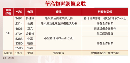基地台需求先行 small cell緊接在後在未來5G基礎設施的佈建上,昇達科(3491)勢必仍是華為重要的供應鏈之一(華為是其第二大客戶,營收占比達二○%以上),主要產品有含微波、毫米波被動元件、射頻天線組件、無線電通訊,在全球微波元件市占率約為八%~一○%。雖說中國競爭對手具有成本優勢,但因技術落後於昇達科,對華為來說,仍具有必要性,近期已與華為開始合作5G研發專案。隨著行動網路速度及傳輸量愈來愈大,透過微波回傳網路已經不夠,進入4.5G後毫米波的應用已逐步增溫,預期到了5G時代,毫米波將躍居主流。昇達科毫米波產品已開始出貨,上半年營收占比約八%,由毛利率超過六成,遠高於平均的四○%,未來隨毫米波產品比重提高,不僅有助優化產品組合,更可提升整體獲利表現。同樣生產基地台所需的功率放大器(PA)、遠端射頻模組(RRH)及小型基地台的台揚(2314),未來也有望藉由鴻海(2317)與華為的潛在合作機會(代工電信設備),打入華為供應鏈。因5G基地台採用陣列天線,相對應的small cell數量將較4G時代大幅增加,潛在商機十分可觀。公司也有佈局物聯網相關產品,主要為無線射頻識別(RFID)模組,頻段可傳輸十公尺以上,可用於庫存盤點、鎖定位置等功能,未來有望導入醫療、大型活動,在5G建置完成後大數據產品將會帶來公司新的營收動能。華為small cell產品線總裁彭紅華今年曾表示,在未來5G的時代,為了讓客戶體驗更好的網路服務,small cell的發展將是未來的趨勢,相較於戶外,室內行動網路的使用占比約八○%,5G傳輸頻譜提高,大型基地台將有網路覆蓋率限縮及穿透性不足的問題,透過small cell的建置將可以解決,並透露出與台廠合作的意願。華為早在三~四年前就成立small cell產品線部門,產品涵蓋室內及室外,大功率及小功率小型small cell。台廠中已有相關產品開始出貨的有中磊(5388)、正文(4906)、合勤控(3704)、智易(3596)及明泰(3380)等。其中,正文過去就是華為的合作夥伴,使用海思Balong 750 LTE晶片組開發相關軟硬體,成功通過華為測試並順利出貨,也參與華為LTE Cat 6 及Cat9/Cat12 CPE室內及室外機種的研發設計與生產。合勤控則曾透過子公司盟創科技(MitraStar)承接華為4G產品的代工訂單,可提供代工的產品包含Small Cell、超高速數位用戶迴路(VDSL)、被動式光纖網路(PON)、及綜合業務接入網(MSAN)等。預期正文及合勤控可望藉由過去與華為的合作關係,率先取得5G時代small cell的商機門票。
